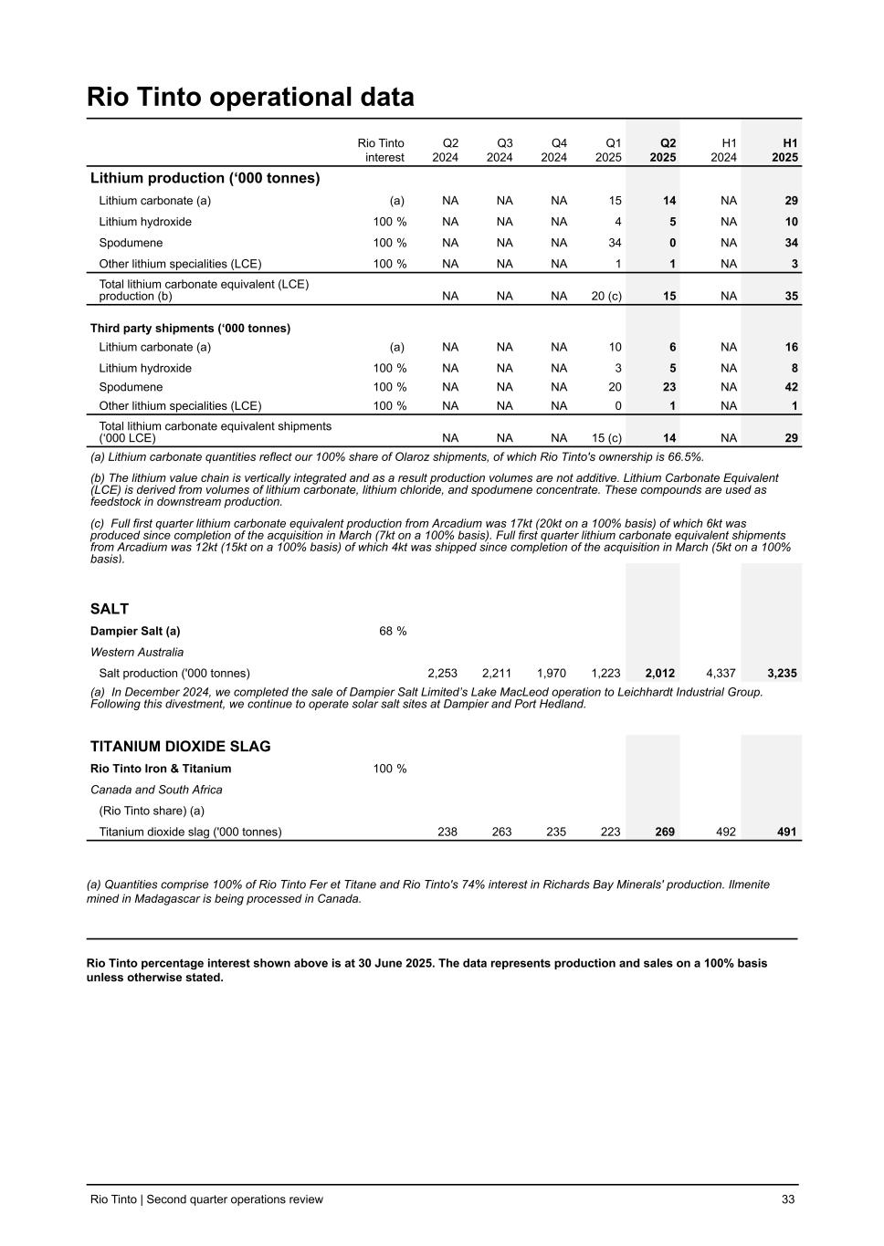 Rio Tinto operational data Rio Tinto interest Q2 2024 Q3 2024 Q4 2024 Q1 2025 Q2 2025 H1 2024 H1 2025 Lithium production (‘000 tonnes) Lithium carbonate (a) (a) NA NA NA 15 14 NA 29 Lithium hydroxide 100 % NA NA NA 4 5 NA 10 Spodumene 100 % NA NA NA 34 0 NA 34 Other lithium specialities (LCE) 100 % NA NA NA 1 1 NA 3 Total lithium carbonate equivalent (LCE) production (b) NA NA NA 20 (c) 15 NA 35 Third party shipments (‘000 tonnes) Lithium carbonate (a) (a) NA NA NA 10 6 NA 16 Lithium hydroxide 100 % NA NA NA 3 5 NA 8 Spodumene 100 % NA NA NA 20 23 NA 42 Other lithium specialities (LCE) 100 % NA NA NA 0 1 NA 1 Total lithium carbonate equivalent shipments (‘000 LCE) NA NA NA 15 (c) 14 NA 29 (a) Lithium carbonate quantities reflect our 100% share of Olaroz shipments, of which Rio Tinto's ownership is 66.5%. (b) The lithium value chain is vertically integrated and as a result production volumes are not additive. Lithium Carbonate Equivalent (LCE) is derived from volumes of lithium carbonate, lithium chloride, and spodumene concentrate. These compounds are used as feedstock in downstream production. (c) Full first quarter lithium carbonate equivalent production from Arcadium was 17kt (20kt on a 100% basis) of which 6kt was produced since completion of the acquisition in March (7kt on a 100% basis). Full first quarter lithium carbonate equivalent shipments from Arcadium was 12kt (15kt on a 100% basis) of which 4kt was shipped since completion of the acquisition in March (5kt on a 100% basis). SALT Dampier Salt (a) 68 % Western Australia Salt production ('000 tonnes) 2,253 2,211 1,970 1,223 2,012 4,337 3,235 (a) In December 2024, we completed the sale of Dampier Salt Limited’s Lake MacLeod operation to Leichhardt Industrial Group. Following this divestment, we continue to operate solar salt sites at Dampier and Port Hedland. TITANIUM DIOXIDE SLAG Rio Tinto Iron & Titanium 100 % Canada and South Africa (Rio Tinto share) (a) Titanium dioxide slag ('000 tonnes) 238 263 235 223 269 492 491 (a) Quantities comprise 100% of Rio Tinto Fer et Titane and Rio Tinto's 74% interest in Richards Bay Minerals' production. Ilmenite mined in Madagascar is being processed in Canada. Rio Tinto percentage interest shown above is at 30 June 2025. The data represents production and sales on a 100% basis unless otherwise stated. Rio Tinto | Second quarter operations review 33