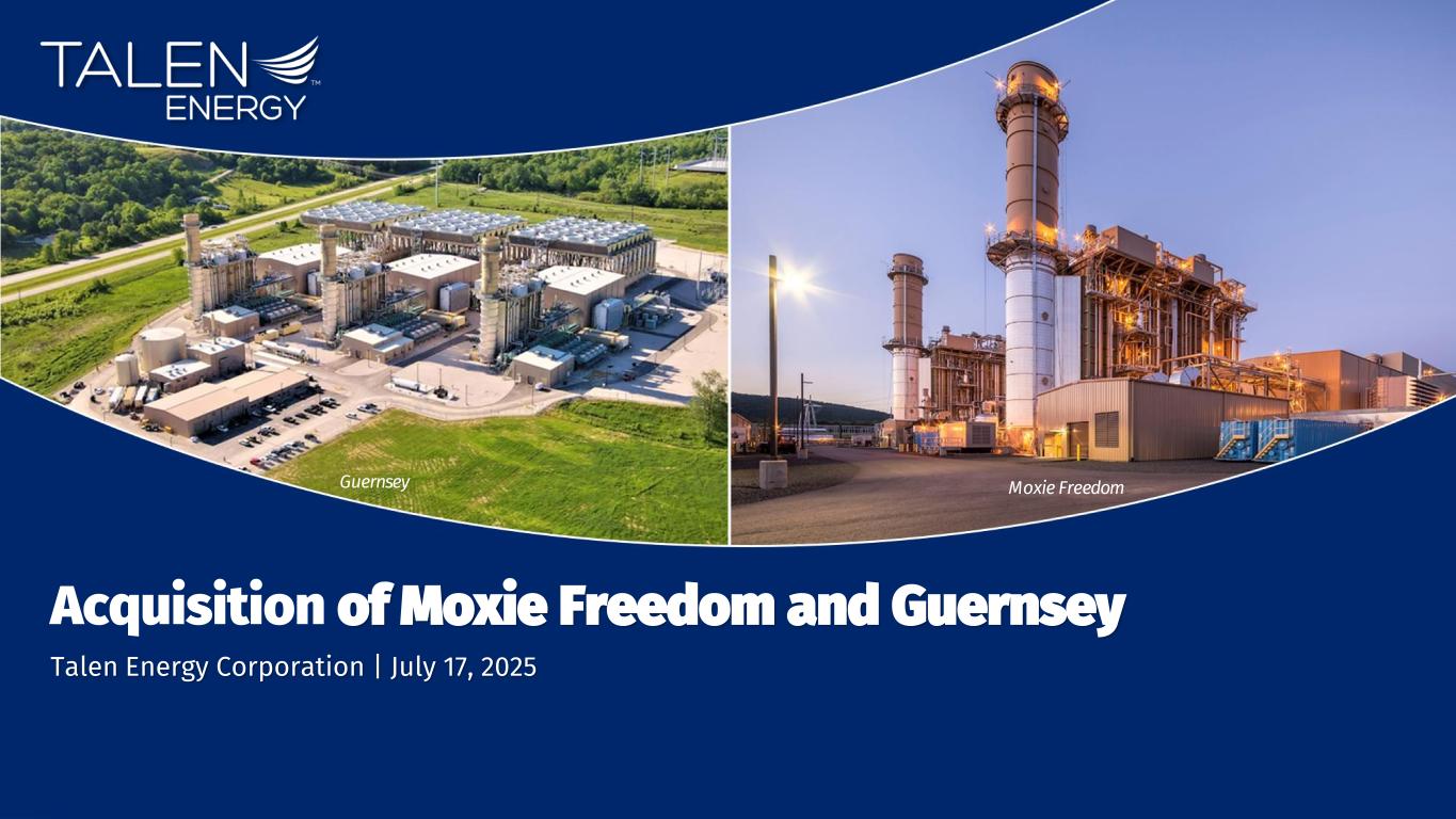 HOUSTON, July 17, 2025 – Talen Energy Corporation (“Talen,” “we,” or “our”) (NASDAQ: TLN), a leading independent power producer, announced it has signed definitive agreements to acquire Caithness Energy’s Moxie Freedom Energy Center (“Moxie”) in Pennsylvania and Caithness Energy and BlackRock’s Guernsey Power Station (“Guernsey”) in Ohio, both combined-cycle gas-fired plants located within the PJM power market.