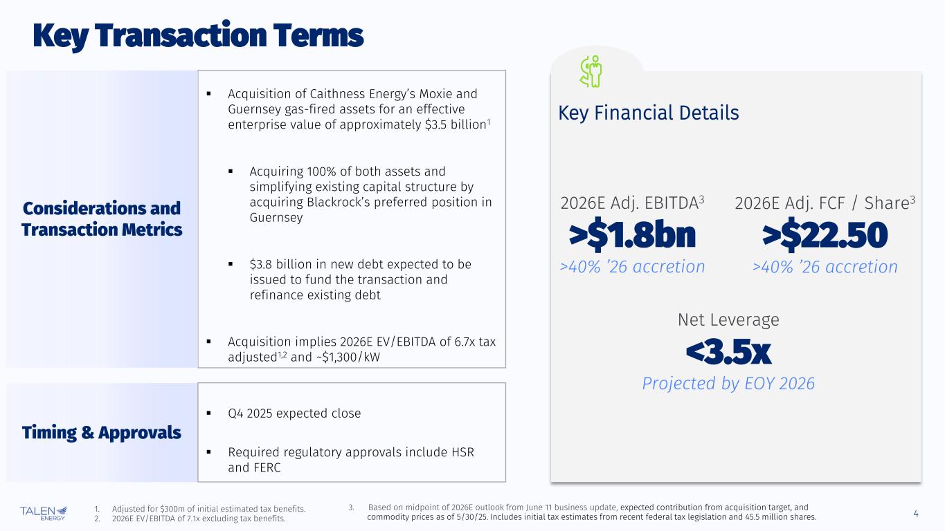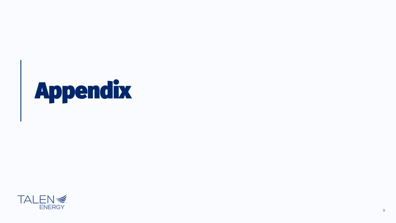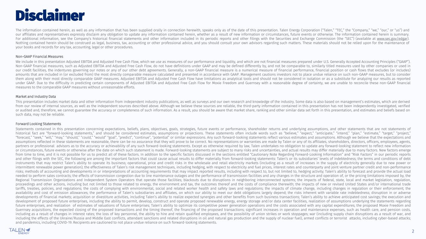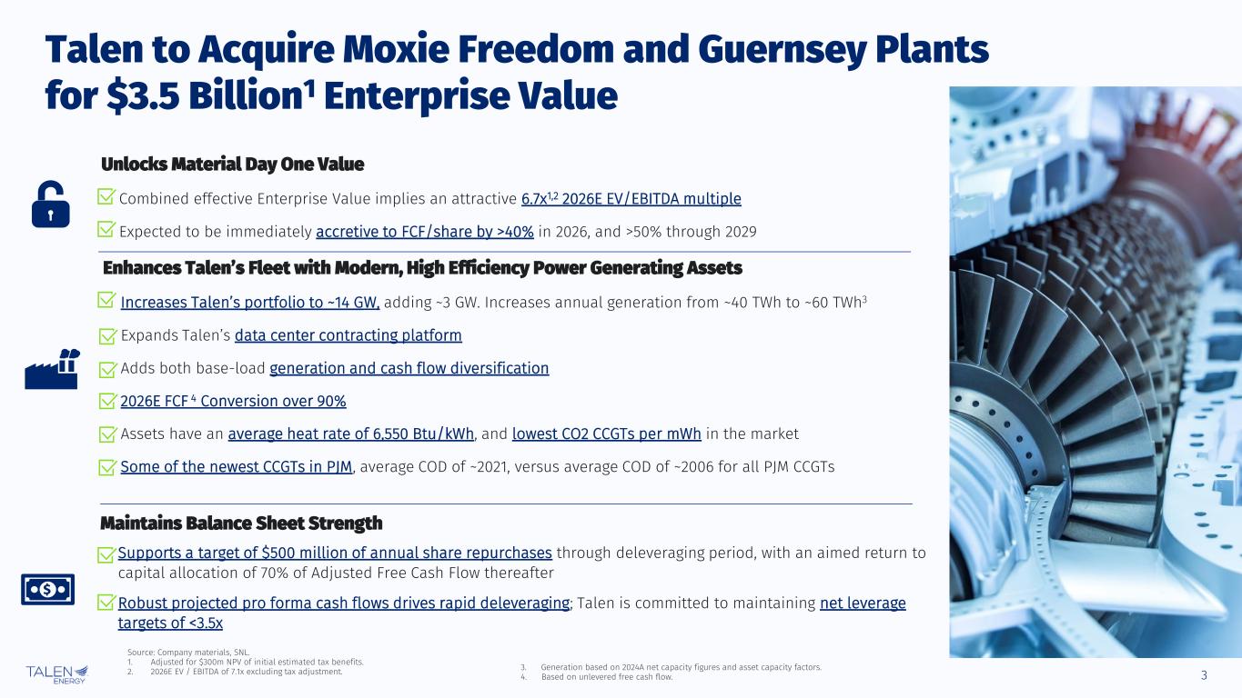 2 The information contained herein, as well as any information that has been supplied orally in connection herewith, speaks only as of the date of this presentation. Talen Energy Corporation (“Talen,” “TEC,” the “Company,” “we,” “our,” or “us”) and our affiliates and representatives expressly disclaim any obligation to update any information contained herein, whether as a result of new information or circumstances, future events or otherwise. The information contained herein is summary. For additional information, see the Company’s historical financial statements and other information included in its periodic reports and other filings with the Securities and Exchange Commission (the “SEC”) (available at www.sec.gov/edgar). Nothing contained herein should be construed as legal, business, tax, accounting or other professional advice, and you should consult your own advisors regarding such matters. These materials should not be relied upon for the maintenance of your books and records for any tax, accounting, legal or other procedures. Non-GAAP Financial Measures We include in this presentation Adjusted EBITDA and Adjusted Free Cash Flow, which we use as measures of our performance and liquidity, and which are not financial measures prepared under U.S. Generally Accepted Accounting Principles (“GAAP”). Non-GAAP financial measures, such as Adjusted EBITDA and Adjusted Free Cash Flow, do not have definitions under GAAP and may be defined differently by, and not be comparable to, similarly titled measures used by other companies or used in our credit facilities, the indentures governing our notes or any of our other debt agreements. Generally, a non-GAAP financial measure is a numerical measure of financial performance, financial position or cash flows that excludes (or includes) amounts that are included in (or excluded from) the most directly comparable measure calculated and presented in accordance with GAAP. Management cautions investors not to place undue reliance on such non-GAAP measures, but to consider them along with their most directly comparable GAAP measures. Adjusted EBITDA and Adjusted Free Cash Flow have limitations as analytical tools and should not be considered in isolation or as a substitute for analyzing our results as reported under GAAP. Due to the difficulty in predicting certain components of Adjusted EBITDA and Adjusted Free Cash Flow for Moxie Freedom and Guernsey with a reasonable degree of certainty, we are unable to reconcile these non-GAAP financial measures to the comparable GAAP measures without unreasonable efforts. Market and Industry Data This presentation includes market data and other information from independent industry publications, as well as surveys and our own research and knowledge of the industry. Some data is also based on management’s estimates, which are derived from our review of internal sources, as well as the independent sources described above. Although we believe these sources are reliable, the third-party information contained in this presentation has not been independently investigated, verified or audited and, therefore, we cannot guarantee the accuracy or completeness of such information. As a result, you should be aware that market share, ranking and other similar data set forth in this presentation, and estimates and beliefs based on such data, may not be reliable. Forward Looking Statements Statements contained in this presentation concerning expectations, beliefs, plans, objectives, goals, strategies, future events or performance, shareholder returns and underlying assumptions, and other statements that are not statements of historical fact are “forward-looking statements,” and should be considered estimates, assumptions or projections. These statements often include words such as “believe,” “expect,” “anticipate,” “intend,” “plan,” “estimate,” “target,” “project,” “forecast,” “seek,” “will,” “may,” “should,” “could,” “would” “goal”, “predict”, “continue”, “potential” or similar expressions. Any such forward-looking statements reflect various estimates and assumptions. Although we believe that the expectations and assumptions reflected in these statements are reasonable, there can be no assurance that they will prove to be correct. No representations or warranties are made by Talen or any of its affiliates, shareholders, directors, officers, employees, agents, partners or professional advisors as to the accuracy or achievability of any such forward-looking statements. Except as otherwise required by law, Talen undertakes no obligation to update any forward-looking statement to reflect new information or circumstances, future events or otherwise after the date on which such statement is made. Forward-looking statements are subject to many risks and uncertainties, and actual results may differ materially due to many factors. New factors emerge from time to time, and it is not possible for us to predict all of these factors. In addition to the specific factors discussed in the sections entitled “Cautionary Note Regarding Forward-Looking Information” and “Risk Factors” in our periodic reports and other filings with the SEC, the following are among the important factors that could cause actual results to differ materially from forward-looking statements: Talen’s or its subsidiaries’ levels of indebtedness; the terms and conditions of debt instruments that may restrict Talen’s ability to operate its business; operational, price and credit risks in the wholesale and retail electricity markets (including as a result of increases in the supply of electricity generally due to new power or intermittent renewable power generation); the effectiveness of Talen’s risk management techniques, including hedging, with respect to electricity and fuel prices, interest rates and counterparty and joint venture partner credit
