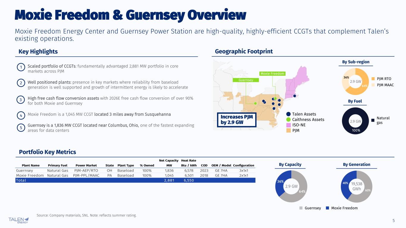 4 Key Transaction Terms Considerations and Transaction Metrics ▪ Acquisition of Caithness Energy’s Moxie and Guernsey gas-fired assets for an effective enterprise value of approximately $3.5 billion1 ▪ Acquiring 100% of both assets and simplifying existing capital structure by acquiring Blackrock’s preferred position in Guernsey ▪ $3.8 billion in new debt expected to be issued to fund the transaction and refinance existing debt ▪ Acquisition implies 2026E EV/EBITDA of 6.7x tax adjusted1,2 and ~$1,300/kW ▪ Q4 2025 expected close ▪ Required regulatory approvals include HSR and FERC Timing & Approvals 1. Adjusted for $300m of initial estimated tax benefits. 2. 2026E EV/EBITDA of 7.1x excluding tax benefits. Key Financial Details 2026E Adj. EBITDA3 >$1.8bn >40% ’26 accretion 2026E Adj. FCF / Share3 >$22.50 >40% ’26 accretion Net Leverage <3.5x Projected by EOY 2026 3. Based on midpoint of 2026E outlook from June 11 business update, expected contribution from acquisition target, and commodity prices as of 5/30/25. Includes initial tax estimates from recent federal tax legislation and 45.5 million shares.