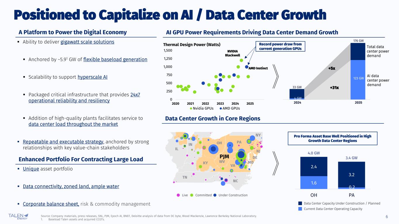 5 Net Capacity Heat Rate Plant Name Primary Fuel Power Market State Plant Type % Owned MW Btu / kWh COD OEM / Model Configuration Guernsey Natural Gas PJM-AEP/RTO OH Baseload 100% 1,836 6,578 2023 GE 7HA 3x1x1 Moxie Freedom Natural Gas PJM-PPL/MAAC PA Baseload 100% 1,045 6,501 2018 GE 7HA 2x1x1 Total 2,881 6,550 Scaled portfolio of CCGTs: fundamentally advantaged 2,881 MW portfolio in core markets across PJM Well positioned plants: presence in key markets where reliability from baseload generation is well supported and growth of intermittent energy is likely to accelerate High free cash flow conversion assets with 2026E free cash flow conversion of over 90% for both Moxie and Guernsey Moxie Freedom is a 1,045 MW CCGT located 3 miles away from Susquehanna Guernsey is a 1,836 MW CCGT located near Columbus, Ohio, one of the fastest expanding areas for data centers Moxie Freedom Energy Center and Guernsey Power Station are high-quality, highly-efficient CCGTs that complement Talen’s existing operations. Key Highlights Geographic Footprint Portfolio Key Metrics 64% 36% By Fuel 100%1 Natural gas 3 2.9 GW 2.9 GW PJM RTO By Sub-region 2 1 2 3 4 By Capacity By Generation 64% 36% Guernsey Moxie Freedom 19,538 GWh 2.9 GW PJM MAAC Moxie Freedom & Guernsey Overview Source: Company materials, SNL. Note: reflects summer rating. PJM ISO-NE Talen Assets Caithness AssetsIncreases PJM by 2.9 GW Moxie Freedom Guernsey 5 60% 40%