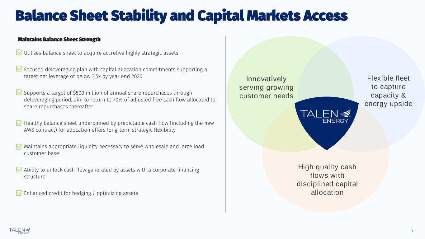 6 1.6 0.2 2.4 3.2 4.0 GW 3.4 GW OH PA A Platform to Power the Digital Economy AI GPU Power Requirements Driving Data Center Demand Growth Positioned to Capitalize on AI / Data Center Growth Source: Company materials, press releases, SNL, PJM, Epoch AI, BNEF, Deloitte analysis of data from DC byte, Wood Mackenzie, Lawrence Berkeley National Laboratory. 1. Baseload Talen assets and acquired CCGTs. +5x +31x Total data center power demand AI data center power demand 4 GW 123 GW 33 GW 176 GW 2024 2035 Data Center Capacity Under Construction / Planned Current Data Center Operating Capacity Record power draw from current generation GPUs Pro Forma Asset Base Well Positioned in High Growth Data Center Regions NVIDIA Blackwell AMD Instinct 0 250 500 750 1,000 1,250 1,500 2020 2021 2022 2023 2024 2025 Thermal Design Power (Watts) Nvidia GPUs AMD GPUs Live Under ConstructionCommitted Data Center Growth in Core Regions ▪ Ability to deliver gigawatt scale solutions ▪ Anchored by ~5.91 GW of flexible baseload generation ▪ Scalability to support hyperscale AI ▪ Packaged critical infrastructure that provides 24x7 operational reliability and resiliency ▪ Addition of high-quality plants facilitates service to data center load throughout the market ▪ Repeatable and executable strategy, anchored by strong relationships with key value-chain stakeholders NY Enhanced Portfolio For Contracting Large Load ▪ Unique asset portfolio ▪ Data connectivity, zoned land, ample water ▪ Corporate balance sheet, risk & commodity management