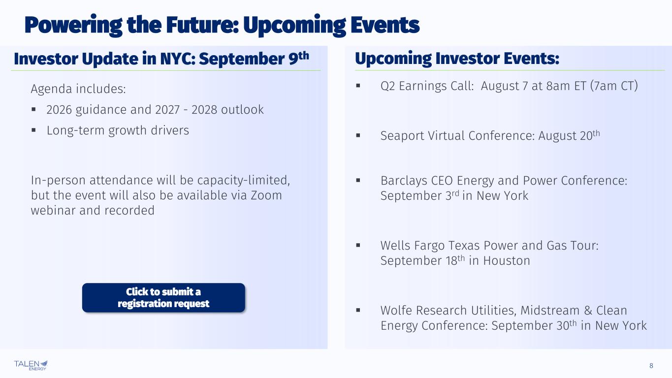 7 Maintains Balance Sheet Strength ▪ Utilizes balance sheet to acquire accretive highly strategic assets ▪ Focused deleveraging plan with capital allocation commitments supporting a target net leverage of below 3.5x by year end 2026 ▪ Supports a target of $500 million of annual share repurchases through deleveraging period; aim to return to 70% of adjusted free cash flow allocated to share repurchases thereafter ▪ Healthy balance sheet underpinned by predictable cash flow (including the new AWS contract) for allocation offers long-term strategic flexibility ▪ Maintains appropriate liquidity necessary to serve wholesale and large load customer base ▪ Ability to unlock cash flow generated by assets with a corporate financing structure ▪ Enhanced credit for hedging / optimizing assets Balance Sheet Stability and Capital Markets Access High quality cash flows with disciplined capital allocation Innovatively serving growing customer needs Flexible fleet to capture capacity & energy upside