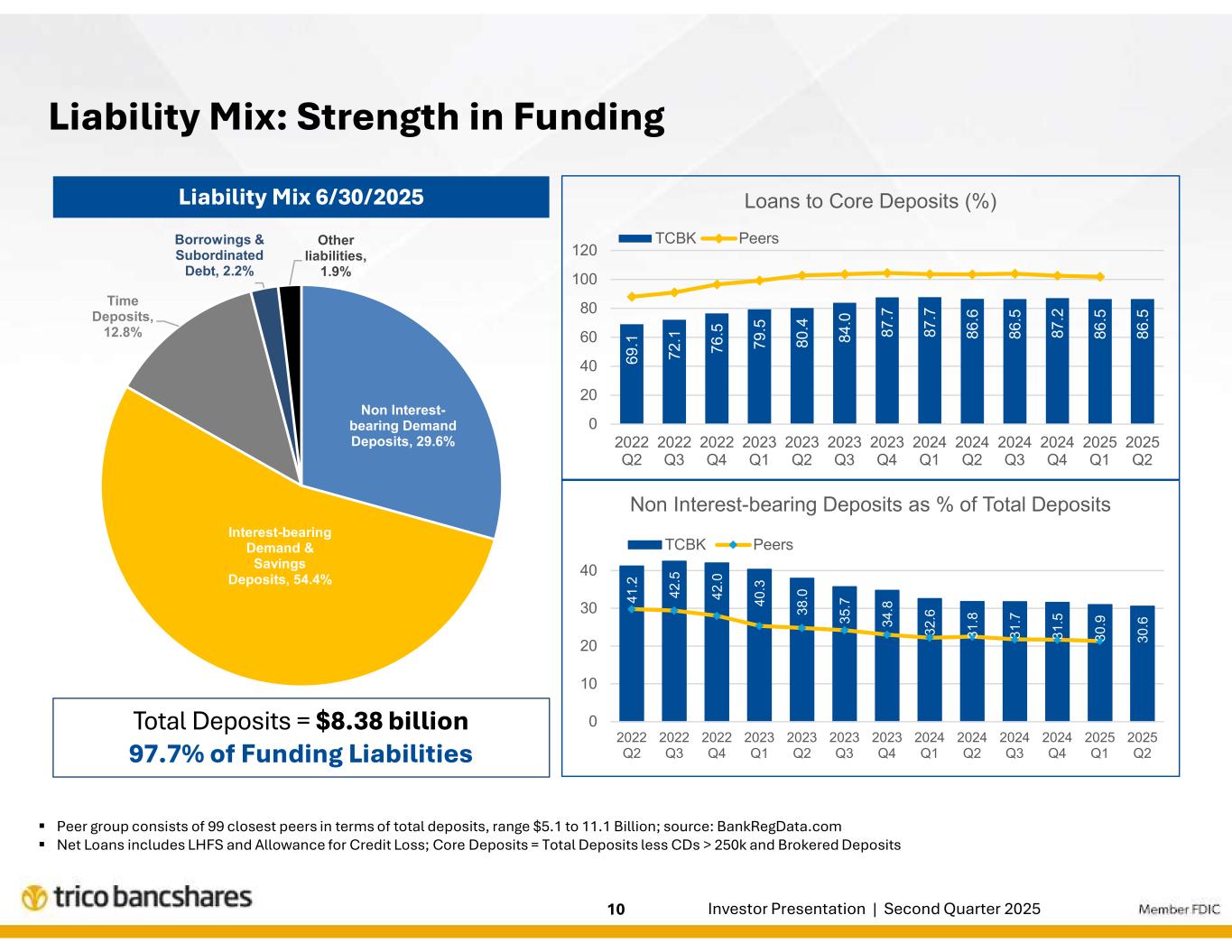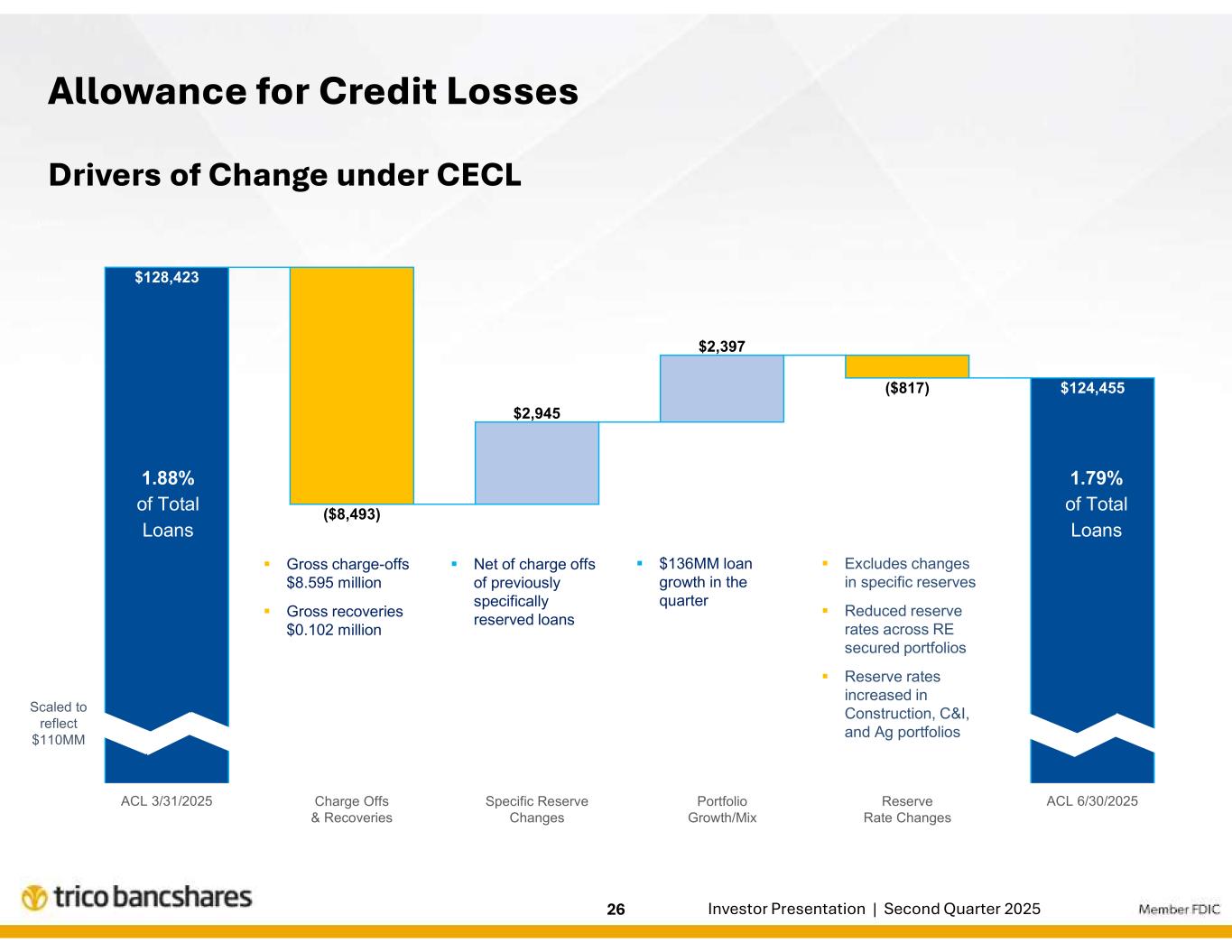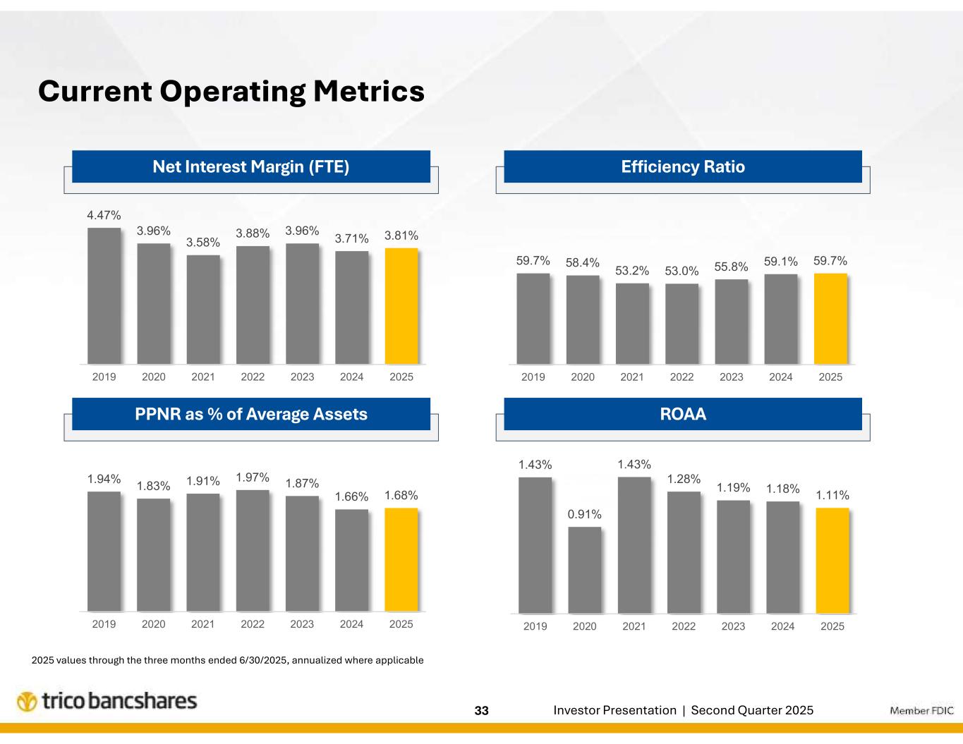| エグゼクティブのコメント「当四半期のハイライトは、貸出・預金ともに新規・拡大した取引関係による成長であった。このようなバランスシートの成長により、2025年の残り期間を通じて純利息収益の拡大がさらに促進されるものと期待しています。リック・スミス社長兼最高経営責任者(CEO)は次のように述べた。「当行の信用の質は引き続き高く、ポートフォリオ全体が当行の歴史的に高い水準に合致した業績を上げ続けることに引き続き自信を持っています。また、ピーター・ヴィーゼEVP兼CFOは、「当行の純金利マージンの見通しは引き続き安定しており、継続的な収益資産利回りと資金調達コストの改善により、純金利収益のさらなる増加が見込まれます。当四半期の人件費の増加は主に生産量の増加によるものですが、会社全体の効率率は低下しており、引き続き営業レバレッジの改善に注力しています。 |