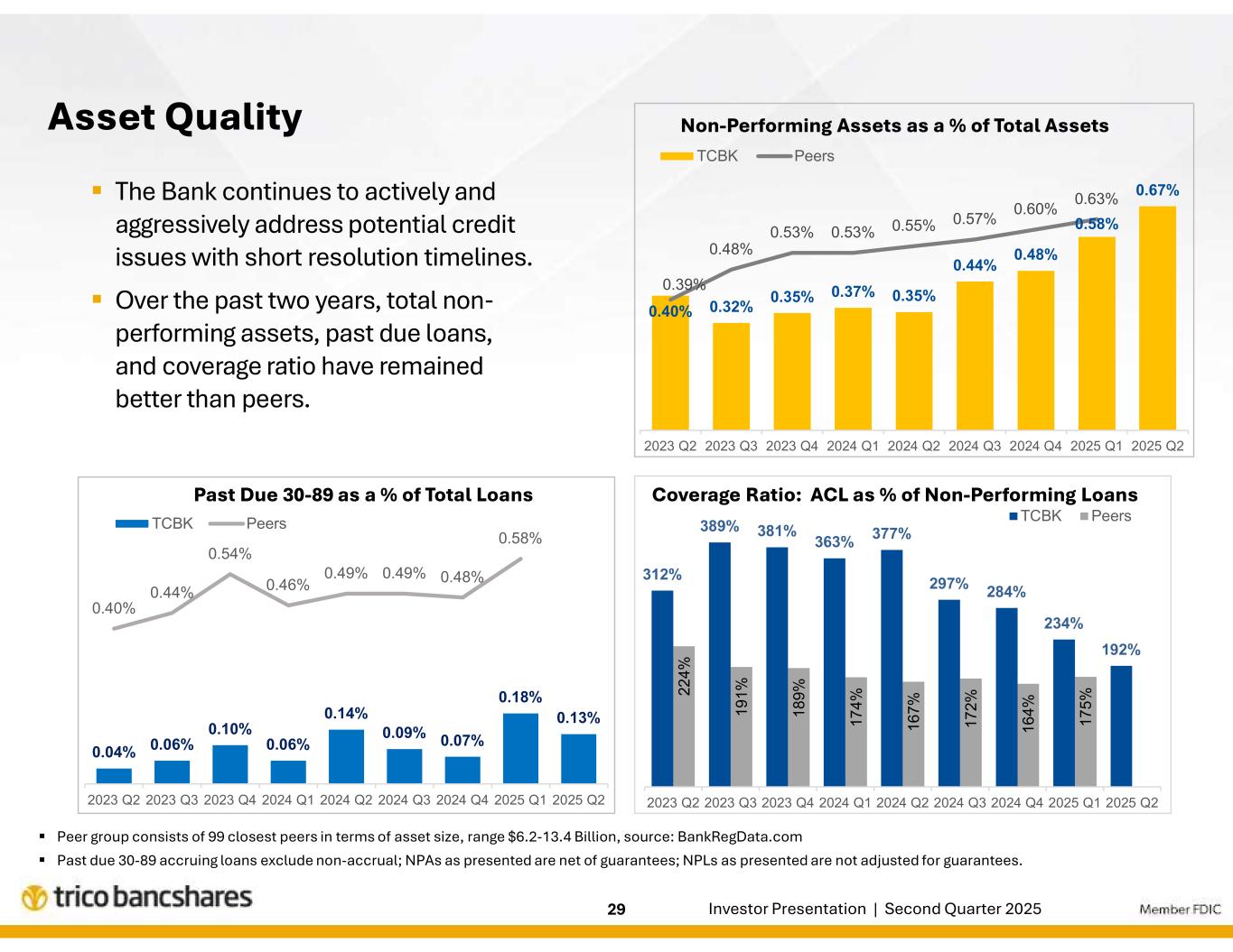 -2025年6月30日現在の貸出金総額に対する貸倒引当金の比率は1.79%であった(直前四半期末は1.88%、2024年6月30日現在 は1.83%)。総資産に対する不良資産の比率は、2025年3月31日時点では0.59%、2024年6月30日時点では0.36%であったのに対し、2025年6月30日時点では0.68%であった。2025年6月30日現在、ACLは不良債権の192%を占めている。