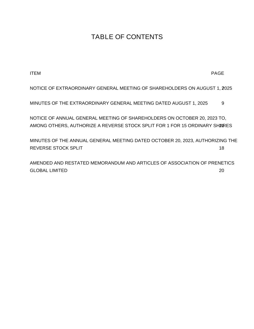 TABLE OF CONTENTS ITEM PAGE NOTICE OF EXTRAORDINARY GENERAL MEETING OF SHAREHOLDERS ON AUGUST 1, 2025 MINUTES OF THE EXTRAORDINARY GENERAL MEETING DATED AUGUST 1, 2025 9 NOTICE OF ANNUAL GENERAL MEETING OF SHAREHOLDERS ON OCTOBER 20, 2023 TO, AMONG OTHERS, AUTHORIZE A REVERSE STOCK SPLIT FOR 1 FOR 15 ORDINARY SHARES11 MINUTES OF THE ANNUAL GENERAL MEETING DATED OCTOBER 20, 2023, AUTHORIZING THE REVERSE STOCK SPLIT 18 AMENDED AND RESTATED MEMORANDUM AND ARTICLES OF ASSOCIATION OF PRENETICS GLOBAL LIMITED 20