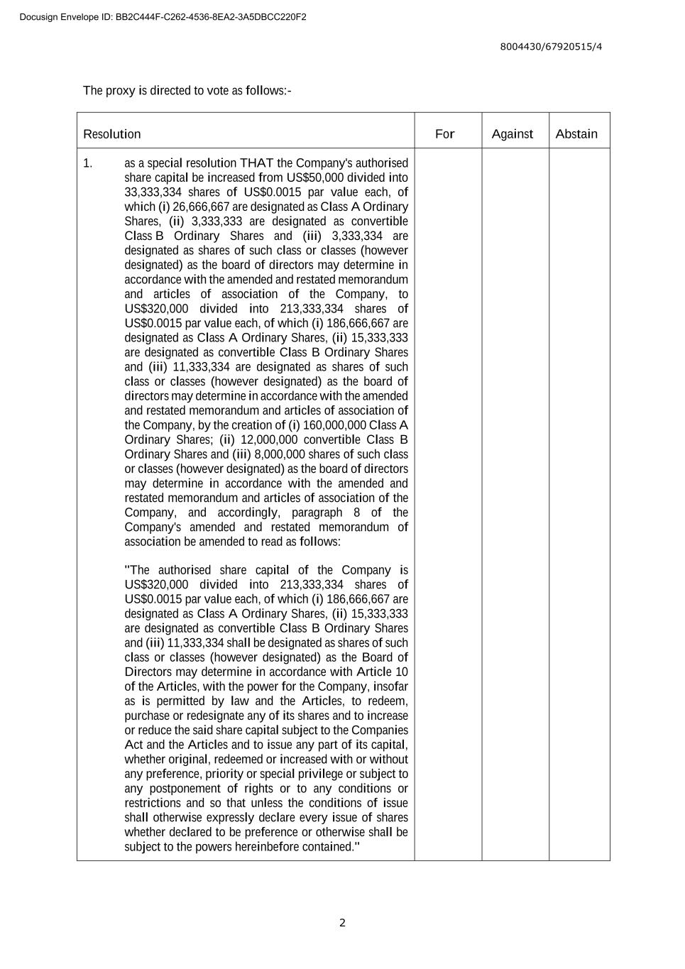 8004430/67920515/4 2 The proxy is directed to vote as follows:- Resolution For Against Abstain 1. as a special resolution THAT the Company's authorised share capital be increased from US$50,000 divided into 33,333,334 shares of US$0.0015 par value each, of which (i) 26,666,667 are designated as Class A Ordinary Shares, (ii) 3,333,333 are designated as convertible Class B Ordinary Shares and (iii) 3,333,334 are designated as shares of such class or classes (however designated) as the board of directors may determine in accordance with the amended and restated memorandum and articles of association of the Company, to US$320,000 divided into 213,333,334 shares of US$0.0015 par value each, of which (i) 186,666,667 are designated as Class A Ordinary Shares, (ii) 15,333,333 are designated as convertible Class B Ordinary Shares and (iii) 11,333,334 are designated as shares of such class or classes (however designated) as the board of directors may determine in accordance with the amended and restated memorandum and articles of association of the Company, by the creation of (i) 160,000,000 Class A Ordinary Shares; (ii) 12,000,000 convertible Class B Ordinary Shares and (iii) 8,000,000 shares of such class or classes (however designated) as the board of directors may determine in accordance with the amended and restated memorandum and articles of association of the Company, and accordingly, paragraph 8 of the Company's amended and restated memorandum of association be amended to read as follows: "The authorised share capital of the Company is US$320,000 divided into 213,333,334 shares of US$0.0015 par value each, of which (i) 186,666,667 are designated as Class A Ordinary Shares, (ii) 15,333,333 are designated as convertible Class B Ordinary Shares and (iii) 11,333,334 shall be designated as shares of such class or classes (however designated) as the Board of Directors may determine in accordance with Article 10 of the Articles, with the power for the Company, insofar as is permitted by law and the Articles, to redeem, purchase or redesignate any of its shares and to increase or reduce the said share capital subject to the Companies Act and the Articles and to issue any part of its capital, whether original, redeemed or increased with or without any preference, priority or special privilege or subject to any postponement of rights or to any conditions or restrictions and so that unless the conditions of issue shall otherwise expressly declare every issue of shares whether declared to be preference or otherwise shall be subject to the powers hereinbefore contained." Docusign Envelope ID: BB2C444F-C262-4536-8EA2-3A5DBCC220F2