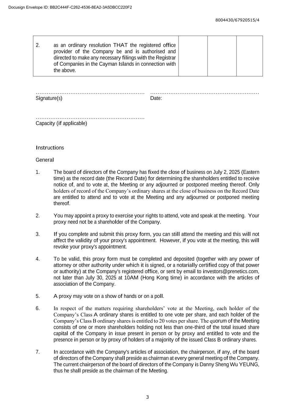 8004430/67920515/4 3 2. as an ordinary resolution THAT the registered office provider of the Company be and is authorised and directed to make any necessary filings with the Registrar of Companies in the Cayman Islands in connection with the above. …………………………………………………… Signature(s) …………………………………………………… Date: …………………………………………………… Capacity (if applicable) Instructions General 1. The board of directors of the Company has fixed the close of business on July 2, 2025 (Eastern time) as the record date (the Record Date) for determining the shareholders entitled to receive notice of, and to vote at, the Meeting or any adjourned or postponed meeting thereof. Only holders of record of the Company’s ordinary shares at the close of business on the Record Date are entitled to attend and to vote at the Meeting and any adjourned or postponed meeting thereof. 2. You may appoint a proxy to exercise your rights to attend, vote and speak at the meeting. Your proxy need not be a shareholder of the Company. 3. If you complete and submit this proxy form, you can still attend the meeting and this will not affect the validity of your proxy's appointment. However, if you vote at the meeting, this will revoke your proxy's appointment. 4. To be valid, this proxy form must be completed and deposited (together with any power of attorney or other authority under which it is signed, or a notarially certified copy of that power or authority) at the Company's registered office, or sent by email to investors@prenetics.com, not later than July 30, 2025 at 10AM (Hong Kong time) in accordance with the articles of association of the Company. 5. A proxy may vote on a show of hands or on a poll. 6. In respect of the matters requiring shareholders’ vote at the Meeting, each holder of the Company’s Class A ordinary shares is entitled to one vote per share, and each holder of the Company’s Class B ordinary shares is entitled to 20 votes per share. The quorum of the Meeting consists of one or more shareholders holding not less than one-third of the total issued share capital of the Company in issue present in person or by proxy and entitled to vote and the presence in person or by proxy of holders of a majority of the issued Class B ordinary shares. 7. In accordance with the Company's articles of association, the chairperson, if any, of the board of directors of the Company shall preside as chairman at every general meeting of the Company. The current chairperson of the board of directors of the Company is Danny Sheng Wu YEUNG, thus he shall preside as the chairman of the Meeting. Docusign Envelope ID: BB2C444F-C262-4536-8EA2-3A5DBCC220F2