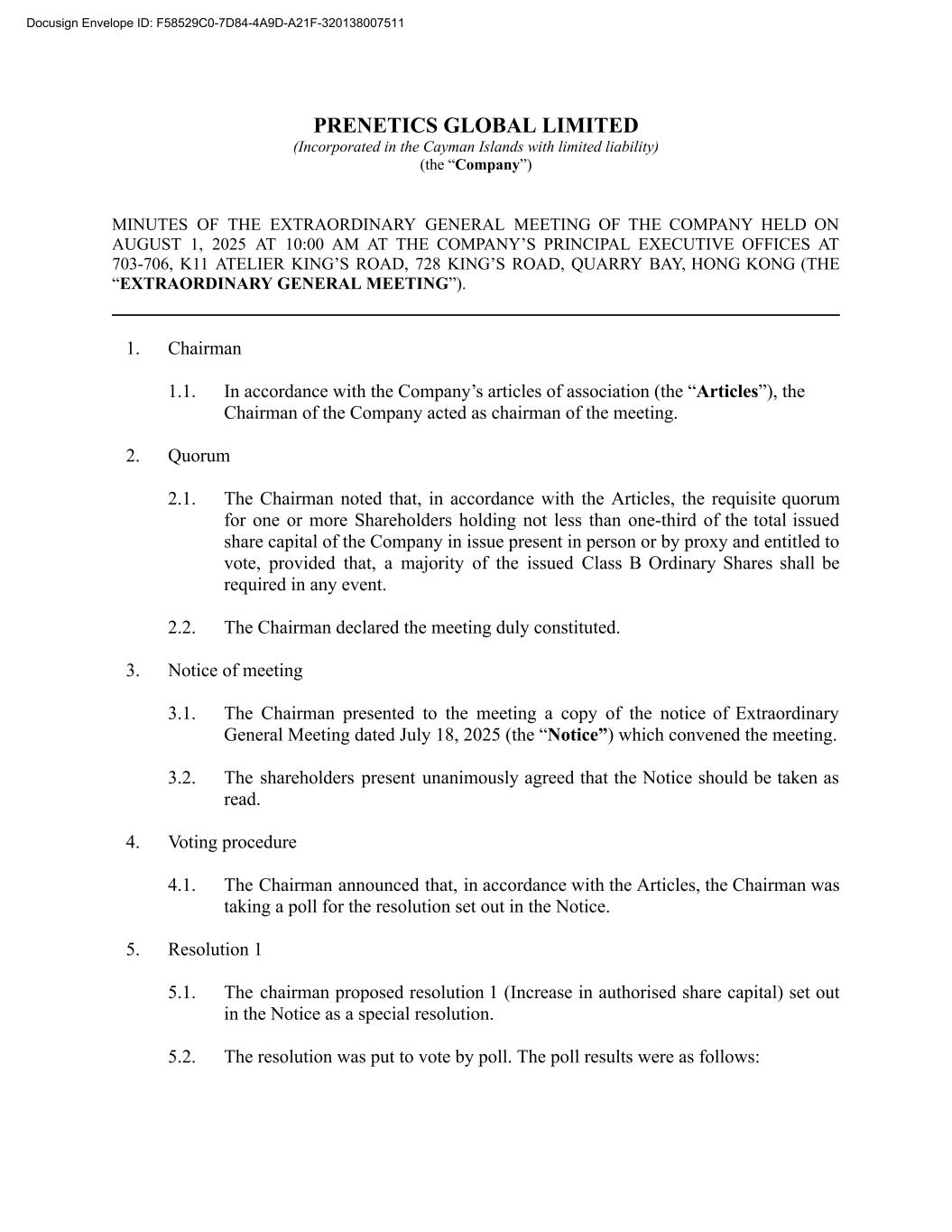 PRENETICS GLOBAL LIMITED (Incorporated in the Cayman Islands with limited liability) (the “Company”) MINUTES OF THE EXTRAORDINARY GENERAL MEETING OF THE COMPANY HELD ON AUGUST 1, 2025 AT 10:00 AM AT THE COMPANY’S PRINCIPAL EXECUTIVE OFFICES AT 703-706, K11 ATELIER KING’S ROAD, 728 KING’S ROAD, QUARRY BAY, HONG KONG (THE “EXTRAORDINARY GENERAL MEETING”). 1. Chairman 1.1. In accordance with the Company’s articles of association (the “Articles”), the Chairman of the Company acted as chairman of the meeting. 2. Quorum 2.1. The Chairman noted that, in accordance with the Articles, the requisite quorum for one or more Shareholders holding not less than one-third of the total issued share capital of the Company in issue present in person or by proxy and entitled to vote, provided that, a majority of the issued Class B Ordinary Shares shall be required in any event. 2.2. The Chairman declared the meeting duly constituted. 3. Notice of meeting 3.1. The Chairman presented to the meeting a copy of the notice of Extraordinary General Meeting dated July 18, 2025 (the “Notice”) which convened the meeting. 3.2. The shareholders present unanimously agreed that the Notice should be taken as read. 4. Voting procedure 4.1. The Chairman announced that, in accordance with the Articles, the Chairman was taking a poll for the resolution set out in the Notice. 5. Resolution 1 5.1. The chairman proposed resolution 1 (Increase in authorised share capital) set out in the Notice as a special resolution. 5.2. The resolution was put to vote by poll. The poll results were as follows: Docusign Envelope ID: F58529C0-7D84-4A9D-A21F-320138007511