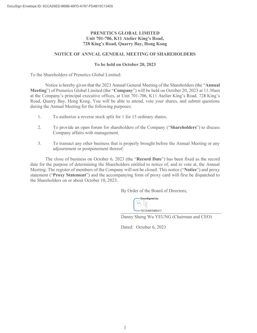 1 PRENETICS GLOBAL LIMITED Unit 701- NOTICE OF ANNUAL GENERAL MEETING OF SHAREHOLDERS To be held on October 20, 2023 To the Shareholders of Prenetics Global Limited: Annual Meeting Company October 20, 2023 at 11:30am s principal executive offices, at Unit 701- Road, Quarry Bay, Hong Kong. You will be able to attend, vote your shares, and submit questions during the Annual Meeting for the following purposes: 1. To authorize a reverse stock split for 1 for 15 ordinary shares. 2. Shareholders Company affairs with management. 3. To transact any other business that is properly brought before the Annual Meeting or any adjournment or postponement thereof. The close of business on October 6 Record Date date for the purpose of determining the Shareholders entitled to notice of, and to vote at, the Annual Meeting. The register of memb Notice Proxy Statement the Shareholders on or about October 10, 2023. By Order of the Board of Directors, Danny Sheng Wu YEUNG (Chairman and CEO) Dated: October 6, 2023