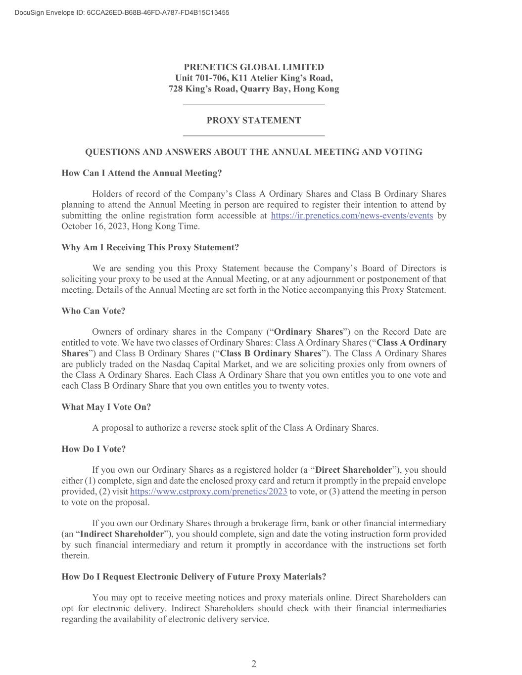 2 PRENETICS GLOBAL LIMITED Unit 701- PROXY STATEMENT QUESTIONS AND ANSWERS ABOUT THE ANNUAL MEETING AND VOTING How Can I Attend the Annual Meeting? planning to attend the Annual Meeting in person are required to register their intention to attend by submitting the online registration form accessible at https://ir.prenetics.com/news-events/events by October 16, 2023, Hong Kong Time. Why Am I Receiving This Proxy Statement? s Board of Directors is soliciting your proxy to be used at the Annual Meeting, or at any adjournment or postponement of that meeting. Details of the Annual Meeting are set forth in the Notice accompanying this Proxy Statement. Who Can Vote? Owners of ord Ordinary Shares Class A Ordinary Shares Class B Ordinary Shares ry Shares are publicly traded on the Nasdaq Capital Market, and we are soliciting proxies only from owners of the Class A Ordinary Shares. Each Class A Ordinary Share that you own entitles you to one vote and each Class B Ordinary Share that you own entitles you to twenty votes. What May I Vote On? A proposal to authorize a reverse stock split of the Class A Ordinary Shares. How Do I Vote? Direct Shareholder either (1) complete, sign and date the enclosed proxy card and return it promptly in the prepaid envelope provided, (2) visit https://www.cstproxy.com/prenetics/2023 to vote, or (3) attend the meeting in person to vote on the proposal. If you own our Ordinary Shares through a brokerage firm, bank or other financial intermediary Indirect Shareholder by such financial intermediary and return it promptly in accordance with the instructions set forth therein. How Do I Request Electronic Delivery of Future Proxy Materials? You may opt to receive meeting notices and proxy materials online. Direct Shareholders can opt for electronic delivery. Indirect Shareholders should check with their financial intermediaries regarding the availability of electronic delivery service.