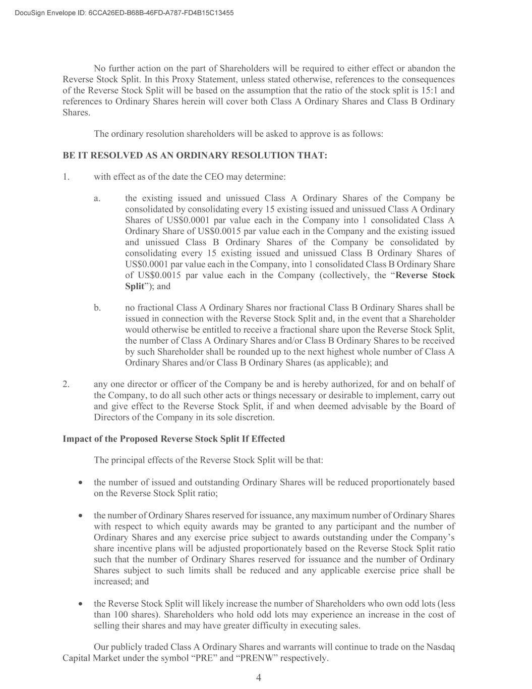 4 No further action on the part of Shareholders will be required to either effect or abandon the Reverse Stock Split. In this Proxy Statement, unless stated otherwise, references to the consequences of the Reverse Stock Split will be based on the assumption that the ratio of the stock split is 15:1 and references to Ordinary Shares herein will cover both Class A Ordinary Shares and Class B Ordinary Shares. The ordinary resolution shareholders will be asked to approve is as follows: BE IT RESOLVED AS AN ORDINARY RESOLUTION THAT: 1. with effect as of the date the CEO may determine: a. the existing issued and unissued Class A Ordinary Shares of the Company be consolidated by consolidating every 15 existing issued and unissued Class A Ordinary Shares of US$0.0001 par value each in the Company into 1 consolidated Class A Ordinary Share of US$0.0015 par value each in the Company and the existing issued and unissued Class B Ordinary Shares of the Company be consolidated by consolidating every 15 existing issued and unissued Class B Ordinary Shares of US$0.0001 par value each in the Company, into 1 consolidated Class B Ordinary Share Reverse Stock Split b. no fractional Class A Ordinary Shares nor fractional Class B Ordinary Shares shall be issued in connection with the Reverse Stock Split and, in the event that a Shareholder would otherwise be entitled to receive a fractional share upon the Reverse Stock Split, the number of Class A Ordinary Shares and/or Class B Ordinary Shares to be received by such Shareholder shall be rounded up to the next highest whole number of Class A Ordinary Shares and/or Class B Ordinary Shares (as applicable); and 2. any one director or officer of the Company be and is hereby authorized, for and on behalf of the Company, to do all such other acts or things necessary or desirable to implement, carry out and give effect to the Reverse Stock Split, if and when deemed advisable by the Board of Directors of the Company in its sole discretion. Impact of the Proposed Reverse Stock Split If Effected The principal effects of the Reverse Stock Split will be that: the number of issued and outstanding Ordinary Shares will be reduced proportionately based on the Reverse Stock Split ratio; the number of Ordinary Shares reserved for issuance, any maximum number of Ordinary Shares with respect to which equity awards may be granted to any participant and the number of share incentive plans will be adjusted proportionately based on the Reverse Stock Split ratio such that the number of Ordinary Shares reserved for issuance and the number of Ordinary Shares subject to such limits shall be reduced and any applicable exercise price shall be increased; and the Reverse Stock Split will likely increase the number of Shareholders who own odd lots (less than 100 shares). Shareholders who hold odd lots may experience an increase in the cost of selling their shares and may have greater difficulty in executing sales. Our publicly traded Class A Ordinary Shares and warrants will continue to trade on the Nasdaq
