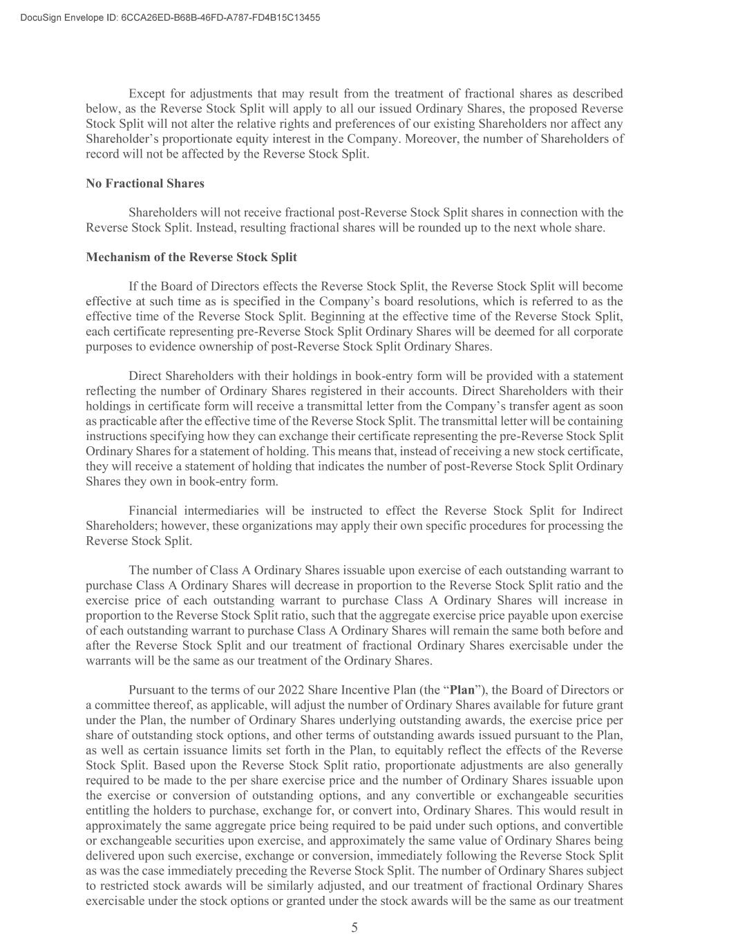 5 Except for adjustments that may result from the treatment of fractional shares as described below, as the Reverse Stock Split will apply to all our issued Ordinary Shares, the proposed Reverse Stock Split will not alter the relative rights and preferences of our existing Shareholders nor affect any f record will not be affected by the Reverse Stock Split. No Fractional Shares Shareholders will not receive fractional post-Reverse Stock Split shares in connection with the Reverse Stock Split. Instead, resulting fractional shares will be rounded up to the next whole share. Mechanism of the Reverse Stock Split If the Board of Directors effects the Reverse Stock Split, the Reverse Stock Split will become effective time of the Reverse Stock Split. Beginning at the effective time of the Reverse Stock Split, each certificate representing pre-Reverse Stock Split Ordinary Shares will be deemed for all corporate purposes to evidence ownership of post-Reverse Stock Split Ordinary Shares. Direct Shareholders with their holdings in book-entry form will be provided with a statement reflecting the number of Ordinary Shares registered in their accounts. Direct Shareholders with their holdings in certificate form will receive a transmittal lette as practicable after the effective time of the Reverse Stock Split. The transmittal letter will be containing instructions specifying how they can exchange their certificate representing the pre-Reverse Stock Split Ordinary Shares for a statement of holding. This means that, instead of receiving a new stock certificate, they will receive a statement of holding that indicates the number of post-Reverse Stock Split Ordinary Shares they own in book-entry form. Financial intermediaries will be instructed to effect the Reverse Stock Split for Indirect Shareholders; however, these organizations may apply their own specific procedures for processing the Reverse Stock Split. The number of Class A Ordinary Shares issuable upon exercise of each outstanding warrant to purchase Class A Ordinary Shares will decrease in proportion to the Reverse Stock Split ratio and the exercise price of each outstanding warrant to purchase Class A Ordinary Shares will increase in proportion to the Reverse Stock Split ratio, such that the aggregate exercise price payable upon exercise of each outstanding warrant to purchase Class A Ordinary Shares will remain the same both before and after the Reverse Stock Split and our treatment of fractional Ordinary Shares exercisable under the warrants will be the same as our treatment of the Ordinary Shares. Plan a committee thereof, as applicable, will adjust the number of Ordinary Shares available for future grant under the Plan, the number of Ordinary Shares underlying outstanding awards, the exercise price per share of outstanding stock options, and other terms of outstanding awards issued pursuant to the Plan, as well as certain issuance limits set forth in the Plan, to equitably reflect the effects of the Reverse Stock Split. Based upon the Reverse Stock Split ratio, proportionate adjustments are also generally required to be made to the per share exercise price and the number of Ordinary Shares issuable upon the exercise or conversion of outstanding options, and any convertible or exchangeable securities entitling the holders to purchase, exchange for, or convert into, Ordinary Shares. This would result in approximately the same aggregate price being required to be paid under such options, and convertible or exchangeable securities upon exercise, and approximately the same value of Ordinary Shares being delivered upon such exercise, exchange or conversion, immediately following the Reverse Stock Split as was the case immediately preceding the Reverse Stock Split. The number of Ordinary Shares subject to restricted stock awards will be similarly adjusted, and our treatment of fractional Ordinary Shares exercisable under the stock options or granted under the stock awards will be the same as our treatment