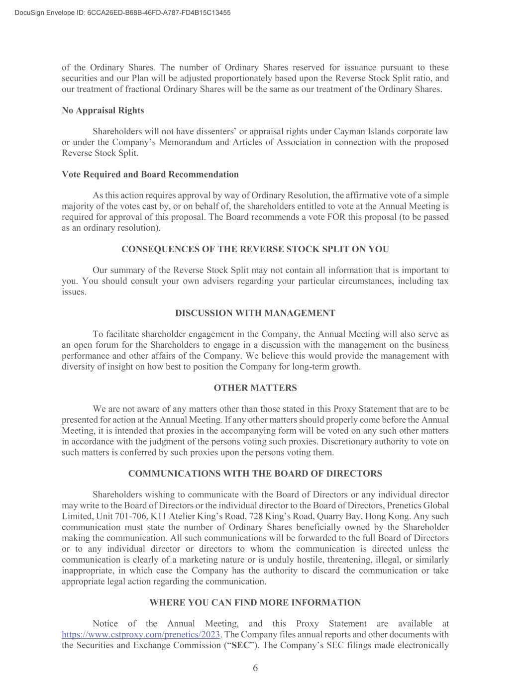 6 of the Ordinary Shares. The number of Ordinary Shares reserved for issuance pursuant to these securities and our Plan will be adjusted proportionately based upon the Reverse Stock Split ratio, and our treatment of fractional Ordinary Shares will be the same as our treatment of the Ordinary Shares. No Appraisal Rights or unde Reverse Stock Split. Vote Required and Board Recommendation As this action requires approval by way of Ordinary Resolution, the affirmative vote of a simple majority of the votes cast by, or on behalf of, the shareholders entitled to vote at the Annual Meeting is required for approval of this proposal. The Board recommends a vote FOR this proposal (to be passed as an ordinary resolution). CONSEQUENCES OF THE REVERSE STOCK SPLIT ON YOU Our summary of the Reverse Stock Split may not contain all information that is important to you. You should consult your own advisers regarding your particular circumstances, including tax issues. DISCUSSION WITH MANAGEMENT To facilitate shareholder engagement in the Company, the Annual Meeting will also serve as an open forum for the Shareholders to engage in a discussion with the management on the business performance and other affairs of the Company. We believe this would provide the management with diversity of insight on how best to position the Company for long-term growth. OTHER MATTERS We are not aware of any matters other than those stated in this Proxy Statement that are to be presented for action at the Annual Meeting. If any other matters should properly come before the Annual Meeting, it is intended that proxies in the accompanying form will be voted on any such other matters in accordance with the judgment of the persons voting such proxies. Discretionary authority to vote on such matters is conferred by such proxies upon the persons voting them. COMMUNICATIONS WITH THE BOARD OF DIRECTORS Shareholders wishing to communicate with the Board of Directors or any individual director may write to the Board of Directors or the individual director to the Board of Directors, Prenetics Global Limited, Unit 701- communication must state the number of Ordinary Shares beneficially owned by the Shareholder making the communication. All such communications will be forwarded to the full Board of Directors or to any individual director or directors to whom the communication is directed unless the communication is clearly of a marketing nature or is unduly hostile, threatening, illegal, or similarly inappropriate, in which case the Company has the authority to discard the communication or take appropriate legal action regarding the communication. WHERE YOU CAN FIND MORE INFORMATION Notice of the Annual Meeting, and this Proxy Statement are available at https://www.cstproxy.com/prenetics/2023. The Company files annual reports and other documents with SEC gs made electronically
