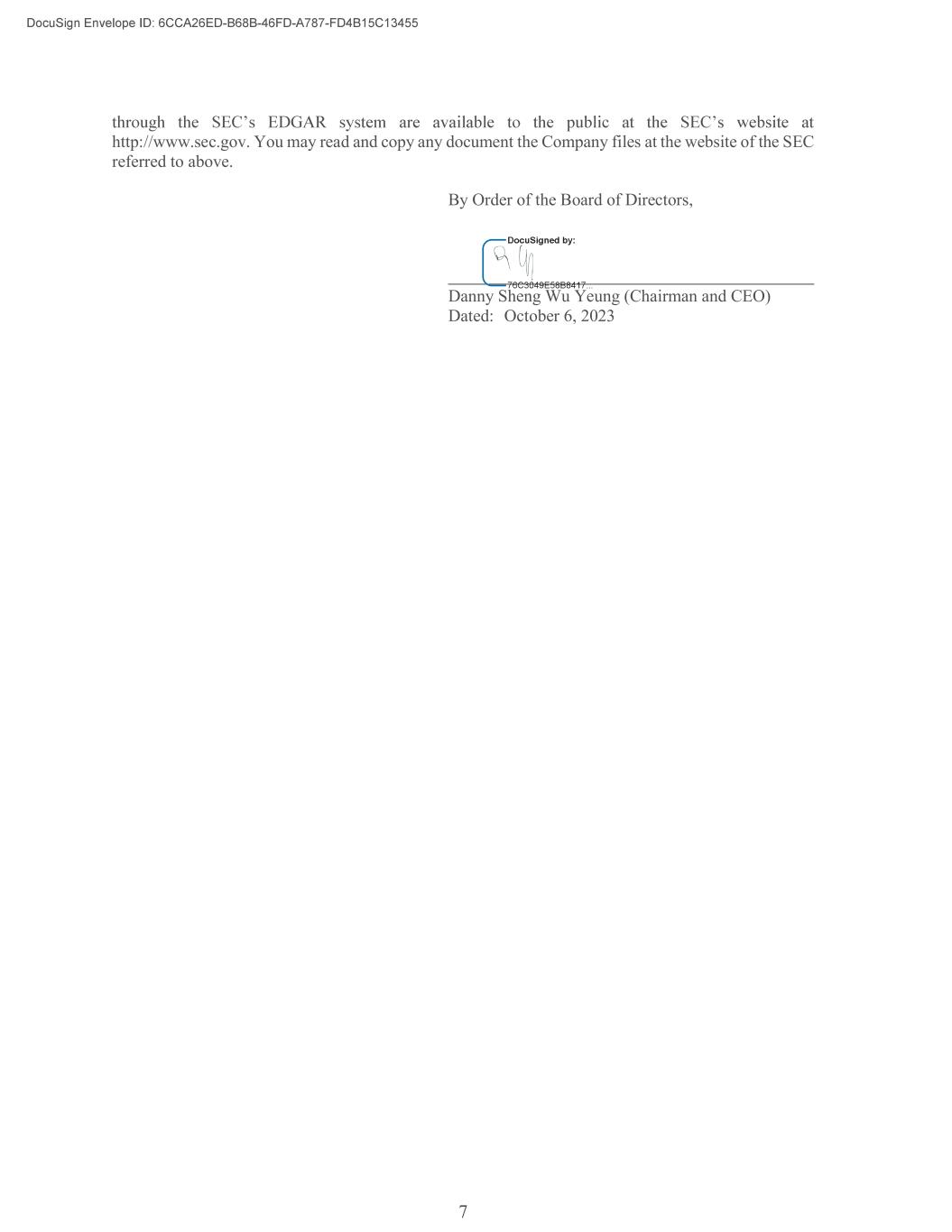 7 http://www.sec.gov. You may read and copy any document the Company files at the website of the SEC referred to above. By Order of the Board of Directors, Danny Sheng Wu Yeung (Chairman and CEO) Dated: October 6, 2023