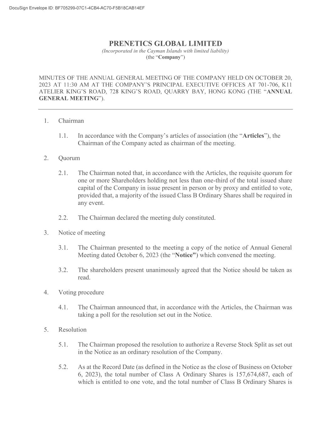 PRENETICS GLOBAL LIMITED (Incorporated in the Cayman Islands with limited liability) Company MINUTES OF THE ANNUAL GENERAL MEETING OF THE COMPANY HELD ON OCTOBER 20, -706, K11 ANNUAL GENERAL MEETING 1. Chairman 1.1. Articles Chairman of the Company acted as chairman of the meeting. 2. Quorum 2.1. The Chairman noted that, in accordance with the Articles, the requisite quorum for one or more Shareholders holding not less than one-third of the total issued share capital of the Company in issue present in person or by proxy and entitled to vote, provided that, a majority of the issued Class B Ordinary Shares shall be required in any event. 2.2. The Chairman declared the meeting duly constituted. 3. Notice of meeting 3.1. The Chairman presented to the meeting a copy of the notice of Annual General Meeting dated October ) which convened the meeting. 3.2. The shareholders present unanimously agreed that the Notice should be taken as read. 4. Voting procedure 4.1. The Chairman announced that, in accordance with the Articles, the Chairman was taking a poll for the resolution set out in the Notice. 5. Resolution 5.1. The Chairman proposed the resolution to authorize a Reverse Stock Split as set out in the Notice as an ordinary resolution of the Company. 5.2. As at the Record Date (as defined in the Notice as the close of Business on October 6, 2023), the total number of Class A Ordinary Shares is 157,674,687, each of which is entitled to one vote, and the total number of Class B Ordinary Shares is
