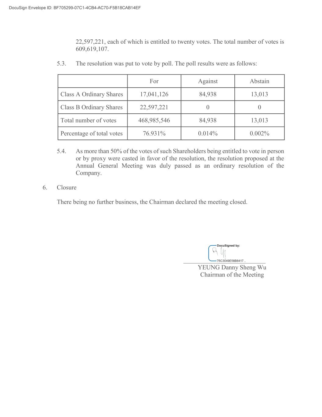 22,597,221, each of which is entitled to twenty votes. The total number of votes is 609,619,107. 5.3. The resolution was put to vote by poll. The poll results were as follows: For Against Abstain Class A Ordinary Shares 17,041,126 84,938 13,013 Class B Ordinary Shares 22,597,221 0 0 Total number of votes 468,985,546 84,938 13,013 Percentage of total votes 76.931% 0.014% 0.002% 5.4. As more than 50% of the votes of such Shareholders being entitled to vote in person or by proxy were casted in favor of the resolution, the resolution proposed at the Annual General Meeting was duly passed as an ordinary resolution of the Company. 6. Closure There being no further business, the Chairman declared the meeting closed. __________________________ YEUNG Danny Sheng Wu Chairman of the Meeting