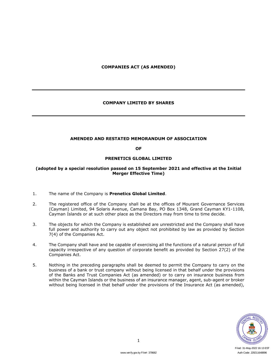 8054020/81436035/2 COMPANIES ACT (AS AMENDED) COMPANY LIMITED BY SHARES AMENDED AND RESTATED MEMORANDUM AND ARTICLES OF ASSOCIATION OF PRENETICS GLOBAL LIMITED (adopted by a special resolution passed on 15 September 2021 and effective at the Initial Merger Effective Time) Filed: 31-May-2022 16:13 EST Auth Code: J29211648896www.verify.gov.ky File#: 378682