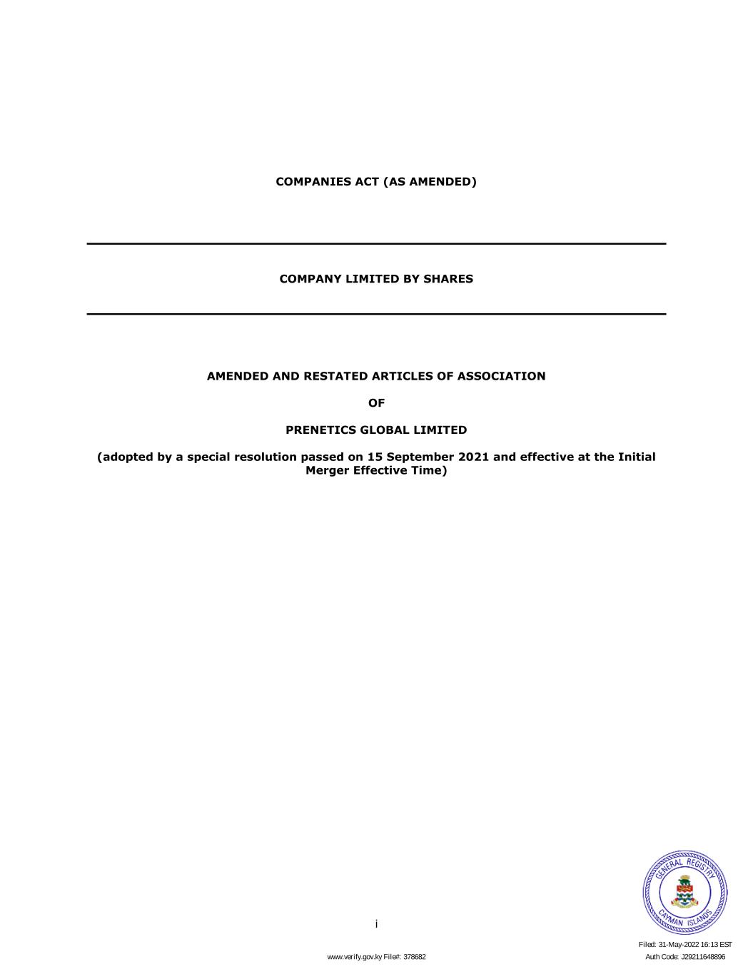 i COMPANIES ACT (AS AMENDED) COMPANY LIMITED BY SHARES AMENDED AND RESTATED ARTICLES OF ASSOCIATION OF PRENETICS GLOBAL LIMITED (adopted by a special resolution passed on 15 September 2021 and effective at the Initial Merger Effective Time) Filed: 31-May-2022 16:13 EST Auth Code: J29211648896www.verify.gov.ky File#: 378682