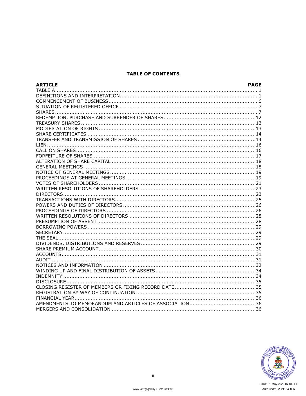 ii TABLE OF CONTENTS ARTICLE PAGE TABLE A ............................................................................................................................. 1 DEFINITIONS AND INTERPRETATION..................................................................................... 1 COMMENCEMENT OF BUSINESS ............................................................................................ 6 SITUATION OF REGISTERED OFFICE ..................................................................................... 7 SHARES ............................................................................................................................. 7 REDEMPTION, PURCHASE AND SURRENDER OF SHARES ......................................................... 12 TREASURY SHARES ............................................................................................................ 13 MODIFICATION OF RIGHTS ................................................................................................. 13 SHARE CERTIFICATES ........................................................................................................ 14 TRANSFER AND TRANSMISSION OF SHARES ......................................................................... 14 LIEN ................................................................................................................................. 16 CALL ON SHARES ............................................................................................................... 16 FORFEITURE OF SHARES .................................................................................................... 17 ALTERATION OF SHARE CAPITAL ......................................................................................... 18 GENERAL MEETINGS .......................................................................................................... 18 NOTICE OF GENERAL MEETINGS .......................................................................................... 19 PROCEEDINGS AT GENERAL MEETINGS ................................................................................ 19 VOTES OF SHAREHOLDERS ................................................................................................. 21 WRITTEN RESOLUTIONS OF SHAREHOLDERS ........................................................................ 23 DIRECTORS ....................................................................................................................... 23 TRANSACTIONS WITH DIRECTORS ....................................................................................... 25 POWERS AND DUTIES OF DIRECTORS .................................................................................. 26 PROCEEDINGS OF DIRECTORS ............................................................................................ 26 WRITTEN RESOLUTIONS OF DIRECTORS .............................................................................. 28 PRESUMPTION OF ASSENT .................................................................................................. 28 BORROWING POWERS ........................................................................................................ 29 SECRETARY ....................................................................................................................... 29 THE SEAL .......................................................................................................................... 29 DIVIDENDS, DISTRIBUTIONS AND RESERVES ....................................................................... 29 SHARE PREMIUM ACCOUNT ................................................................................................. 30 ACCOUNTS ........................................................................................................................ 31 AUDIT .............................................................................................................................. 31 NOTICES AND INFORMATION .............................................................................................. 32 WINDING UP AND FINAL DISTRIBUTION OF ASSETS .............................................................. 34 INDEMNITY ....................................................................................................................... 34 DISCLOSURE ..................................................................................................................... 35 CLOSING REGISTER OF MEMBERS OR FIXING RECORD DATE .................................................. 35 REGISTRATION BY WAY OF CONTINUATION .......................................................................... 35 FINANCIAL YEAR ................................................................................................................ 36 AMENDMENTS TO MEMORANDUM AND ARTICLES OF ASSOCIATION ......................................... 36 MERGERS AND CONSOLIDATION ......................................................................................... 36 Filed: 31-May-2022 16:13 EST Auth Code: J29211648896www.verify.gov.ky File#: 378682