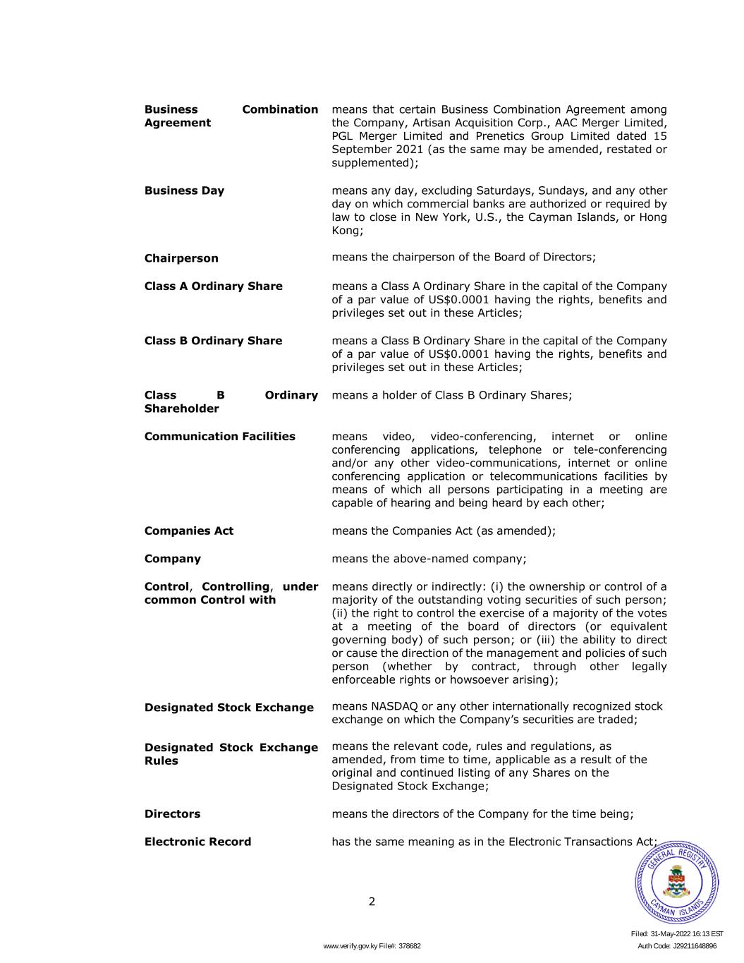 2 Business Combination Agreement means that certain Business Combination Agreement among the Company, Artisan Acquisition Corp., AAC Merger Limited, PGL Merger Limited and Prenetics Group Limited dated 15 September 2021 (as the same may be amended, restated or supplemented); Business Day means any day, excluding Saturdays, Sundays, and any other day on which commercial banks are authorized or required by law to close in New York, U.S., the Cayman Islands, or Hong Kong; Chairperson means the chairperson of the Board of Directors; Class A Ordinary Share means a Class A Ordinary Share in the capital of the Company of a par value of US$0.0001 having the rights, benefits and privileges set out in these Articles; Class B Ordinary Share means a Class B Ordinary Share in the capital of the Company of a par value of US$0.0001 having the rights, benefits and privileges set out in these Articles; Class B Ordinary Shareholder means a holder of Class B Ordinary Shares; Communication Facilities means video, video-conferencing, internet or online conferencing applications, telephone or tele-conferencing and/or any other video-communications, internet or online conferencing application or telecommunications facilities by means of which all persons participating in a meeting are capable of hearing and being heard by each other; Companies Act means the Companies Act (as amended); Company means the above-named company; Control, Controlling, under common Control with means directly or indirectly: (i) the ownership or control of a majority of the outstanding voting securities of such person; (ii) the right to control the exercise of a majority of the votes at a meeting of the board of directors (or equivalent governing body) of such person; or (iii) the ability to direct or cause the direction of the management and policies of such person (whether by contract, through other legally enforceable rights or howsoever arising); Designated Stock Exchange means NASDAQ or any other internationally recognized stock exchange on which the Company’s securities are traded; Designated Stock Exchange Rules means the relevant code, rules and regulations, as amended, from time to time, applicable as a result of the original and continued listing of any Shares on the Designated Stock Exchange; Directors means the directors of the Company for the time being; Electronic Record has the same meaning as in the Electronic Transactions Act; Filed: 31-May-2022 16:13 EST Auth Code: J29211648896www.verify.gov.ky File#: 378682