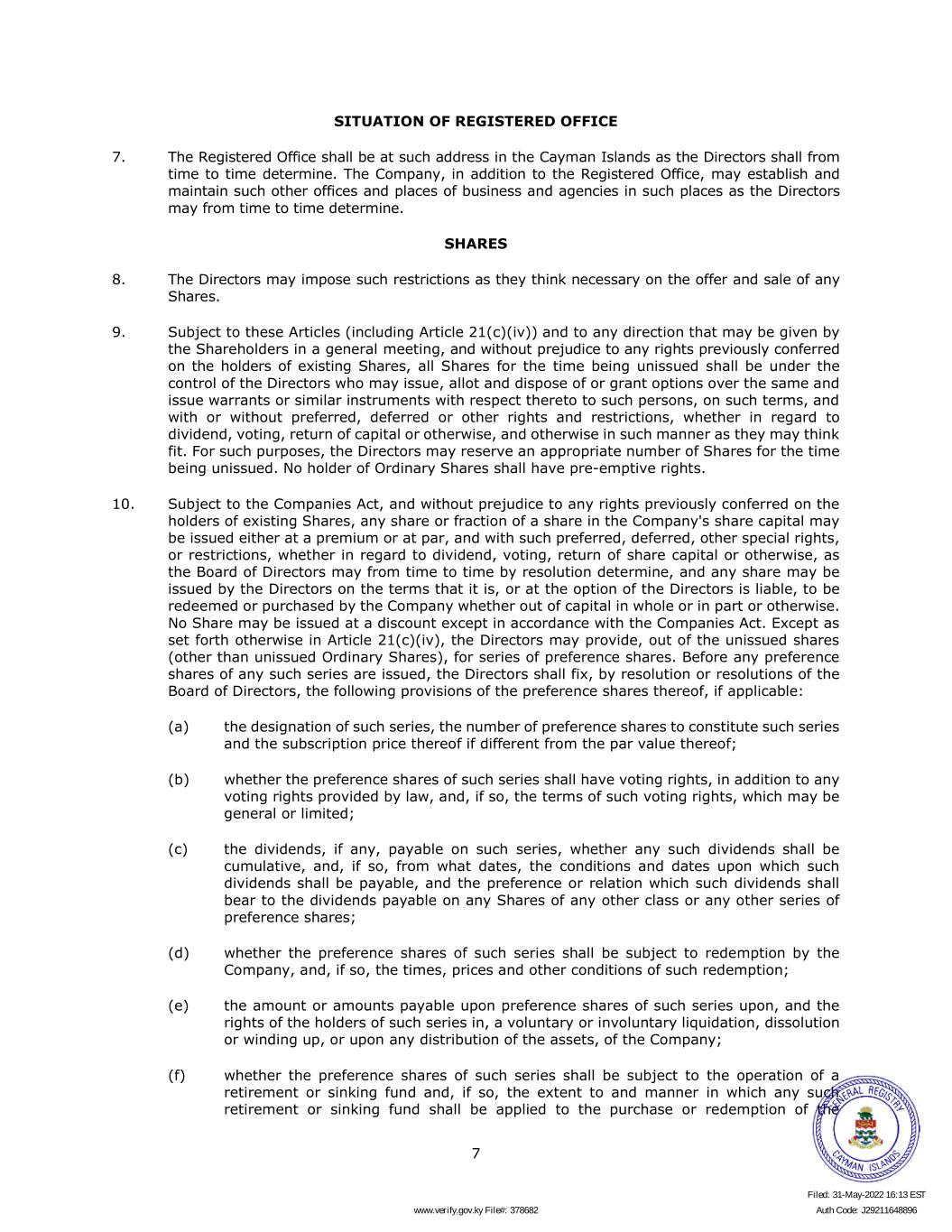 7 SITUATION OF REGISTERED OFFICE 7. The Registered Office shall be at such address in the Cayman Islands as the Directors shall from time to time determine. The Company, in addition to the Registered Office, may establish and maintain such other offices and places of business and agencies in such places as the Directors may from time to time determine. SHARES 8. The Directors may impose such restrictions as they think necessary on the offer and sale of any Shares. 9. Subject to these Articles (including Article 21(c)(iv)) and to any direction that may be given by the Shareholders in a general meeting, and without prejudice to any rights previously conferred on the holders of existing Shares, all Shares for the time being unissued shall be under the control of the Directors who may issue, allot and dispose of or grant options over the same and issue warrants or similar instruments with respect thereto to such persons, on such terms, and with or without preferred, deferred or other rights and restrictions, whether in regard to dividend, voting, return of capital or otherwise, and otherwise in such manner as they may think fit. For such purposes, the Directors may reserve an appropriate number of Shares for the time being unissued. No holder of Ordinary Shares shall have pre-emptive rights. 10. Subject to the Companies Act, and without prejudice to any rights previously conferred on the holders of existing Shares, any share or fraction of a share in the Company's share capital may be issued either at a premium or at par, and with such preferred, deferred, other special rights, or restrictions, whether in regard to dividend, voting, return of share capital or otherwise, as the Board of Directors may from time to time by resolution determine, and any share may be issued by the Directors on the terms that it is, or at the option of the Directors is liable, to be redeemed or purchased by the Company whether out of capital in whole or in part or otherwise. No Share may be issued at a discount except in accordance with the Companies Act. Except as set forth otherwise in Article 21(c)(iv), the Directors may provide, out of the unissued shares (other than unissued Ordinary Shares), for series of preference shares. Before any preference shares of any such series are issued, the Directors shall fix, by resolution or resolutions of the Board of Directors, the following provisions of the preference shares thereof, if applicable: (a) the designation of such series, the number of preference shares to constitute such series and the subscription price thereof if different from the par value thereof; (b) whether the preference shares of such series shall have voting rights, in addition to any voting rights provided by law, and, if so, the terms of such voting rights, which may be general or limited; (c) the dividends, if any, payable on such series, whether any such dividends shall be cumulative, and, if so, from what dates, the conditions and dates upon which such dividends shall be payable, and the preference or relation which such dividends shall bear to the dividends payable on any Shares of any other class or any other series of preference shares; (d) whether the preference shares of such series shall be subject to redemption by the Company, and, if so, the times, prices and other conditions of such redemption; (e) the amount or amounts payable upon preference shares of such series upon, and the rights of the holders of such series in, a voluntary or involuntary liquidation, dissolution or winding up, or upon any distribution of the assets, of the Company; (f) whether the preference shares of such series shall be subject to the operation of a retirement or sinking fund and, if so, the extent to and manner in which any such retirement or sinking fund shall be applied to the purchase or redemption of the Filed: 31-May-2022 16:13 EST Auth Code: J29211648896www.verify.gov.ky File#: 378682