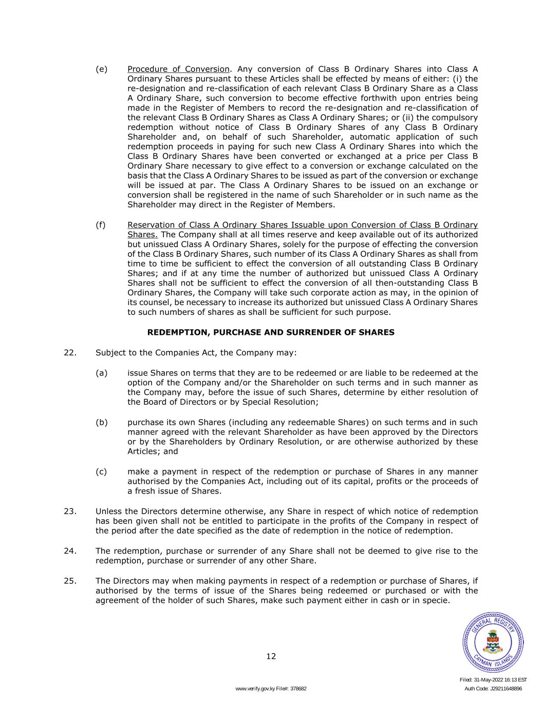 12 (e) Procedure of Conversion. Any conversion of Class B Ordinary Shares into Class A Ordinary Shares pursuant to these Articles shall be effected by means of either: (i) the re-designation and re-classification of each relevant Class B Ordinary Share as a Class A Ordinary Share, such conversion to become effective forthwith upon entries being made in the Register of Members to record the re-designation and re-classification of the relevant Class B Ordinary Shares as Class A Ordinary Shares; or (ii) the compulsory redemption without notice of Class B Ordinary Shares of any Class B Ordinary Shareholder and, on behalf of such Shareholder, automatic application of such redemption proceeds in paying for such new Class A Ordinary Shares into which the Class B Ordinary Shares have been converted or exchanged at a price per Class B Ordinary Share necessary to give effect to a conversion or exchange calculated on the basis that the Class A Ordinary Shares to be issued as part of the conversion or exchange will be issued at par. The Class A Ordinary Shares to be issued on an exchange or conversion shall be registered in the name of such Shareholder or in such name as the Shareholder may direct in the Register of Members. (f) Reservation of Class A Ordinary Shares Issuable upon Conversion of Class B Ordinary Shares. The Company shall at all times reserve and keep available out of its authorized but unissued Class A Ordinary Shares, solely for the purpose of effecting the conversion of the Class B Ordinary Shares, such number of its Class A Ordinary Shares as shall from time to time be sufficient to effect the conversion of all outstanding Class B Ordinary Shares; and if at any time the number of authorized but unissued Class A Ordinary Shares shall not be sufficient to effect the conversion of all then-outstanding Class B Ordinary Shares, the Company will take such corporate action as may, in the opinion of its counsel, be necessary to increase its authorized but unissued Class A Ordinary Shares to such numbers of shares as shall be sufficient for such purpose. REDEMPTION, PURCHASE AND SURRENDER OF SHARES 22. Subject to the Companies Act, the Company may: (a) issue Shares on terms that they are to be redeemed or are liable to be redeemed at the option of the Company and/or the Shareholder on such terms and in such manner as the Company may, before the issue of such Shares, determine by either resolution of the Board of Directors or by Special Resolution; (b) purchase its own Shares (including any redeemable Shares) on such terms and in such manner agreed with the relevant Shareholder as have been approved by the Directors or by the Shareholders by Ordinary Resolution, or are otherwise authorized by these Articles; and (c) make a payment in respect of the redemption or purchase of Shares in any manner authorised by the Companies Act, including out of its capital, profits or the proceeds of a fresh issue of Shares. 23. Unless the Directors determine otherwise, any Share in respect of which notice of redemption has been given shall not be entitled to participate in the profits of the Company in respect of the period after the date specified as the date of redemption in the notice of redemption. 24. The redemption, purchase or surrender of any Share shall not be deemed to give rise to the redemption, purchase or surrender of any other Share. 25. The Directors may when making payments in respect of a redemption or purchase of Shares, if authorised by the terms of issue of the Shares being redeemed or purchased or with the agreement of the holder of such Shares, make such payment either in cash or in specie. Filed: 31-May-2022 16:13 EST Auth Code: J29211648896www.verify.gov.ky File#: 378682