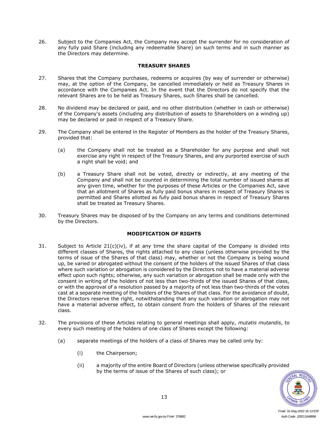 13 26. Subject to the Companies Act, the Company may accept the surrender for no consideration of any fully paid Share (including any redeemable Share) on such terms and in such manner as the Directors may determine. TREASURY SHARES 27. Shares that the Company purchases, redeems or acquires (by way of surrender or otherwise) may, at the option of the Company, be cancelled immediately or held as Treasury Shares in accordance with the Companies Act. In the event that the Directors do not specify that the relevant Shares are to be held as Treasury Shares, such Shares shall be cancelled. 28. No dividend may be declared or paid, and no other distribution (whether in cash or otherwise) of the Company's assets (including any distribution of assets to Shareholders on a winding up) may be declared or paid in respect of a Treasury Share. 29. The Company shall be entered in the Register of Members as the holder of the Treasury Shares, provided that: (a) the Company shall not be treated as a Shareholder for any purpose and shall not exercise any right in respect of the Treasury Shares, and any purported exercise of such a right shall be void; and (b) a Treasury Share shall not be voted, directly or indirectly, at any meeting of the Company and shall not be counted in determining the total number of issued shares at any given time, whether for the purposes of these Articles or the Companies Act, save that an allotment of Shares as fully paid bonus shares in respect of Treasury Shares is permitted and Shares allotted as fully paid bonus shares in respect of Treasury Shares shall be treated as Treasury Shares. 30. Treasury Shares may be disposed of by the Company on any terms and conditions determined by the Directors. MODIFICATION OF RIGHTS 31. Subject to Article 21(c)(iv), if at any time the share capital of the Company is divided into different classes of Shares, the rights attached to any class (unless otherwise provided by the terms of issue of the Shares of that class) may, whether or not the Company is being wound up, be varied or abrogated without the consent of the holders of the issued Shares of that class where such variation or abrogation is considered by the Directors not to have a material adverse effect upon such rights; otherwise, any such variation or abrogation shall be made only with the consent in writing of the holders of not less than two-thirds of the issued Shares of that class, or with the approval of a resolution passed by a majority of not less than two-thirds of the votes cast at a separate meeting of the holders of the Shares of that class. For the avoidance of doubt, the Directors reserve the right, notwithstanding that any such variation or abrogation may not have a material adverse effect, to obtain consent from the holders of Shares of the relevant class. 32. The provisions of these Articles relating to general meetings shall apply, mutatis mutandis, to every such meeting of the holders of one class of Shares except the following: (a) separate meetings of the holders of a class of Shares may be called only by: (i) the Chairperson; (ii) a majority of the entire Board of Directors (unless otherwise specifically provided by the terms of issue of the Shares of such class); or Filed: 31-May-2022 16:13 EST Auth Code: J29211648896www.verify.gov.ky File#: 378682