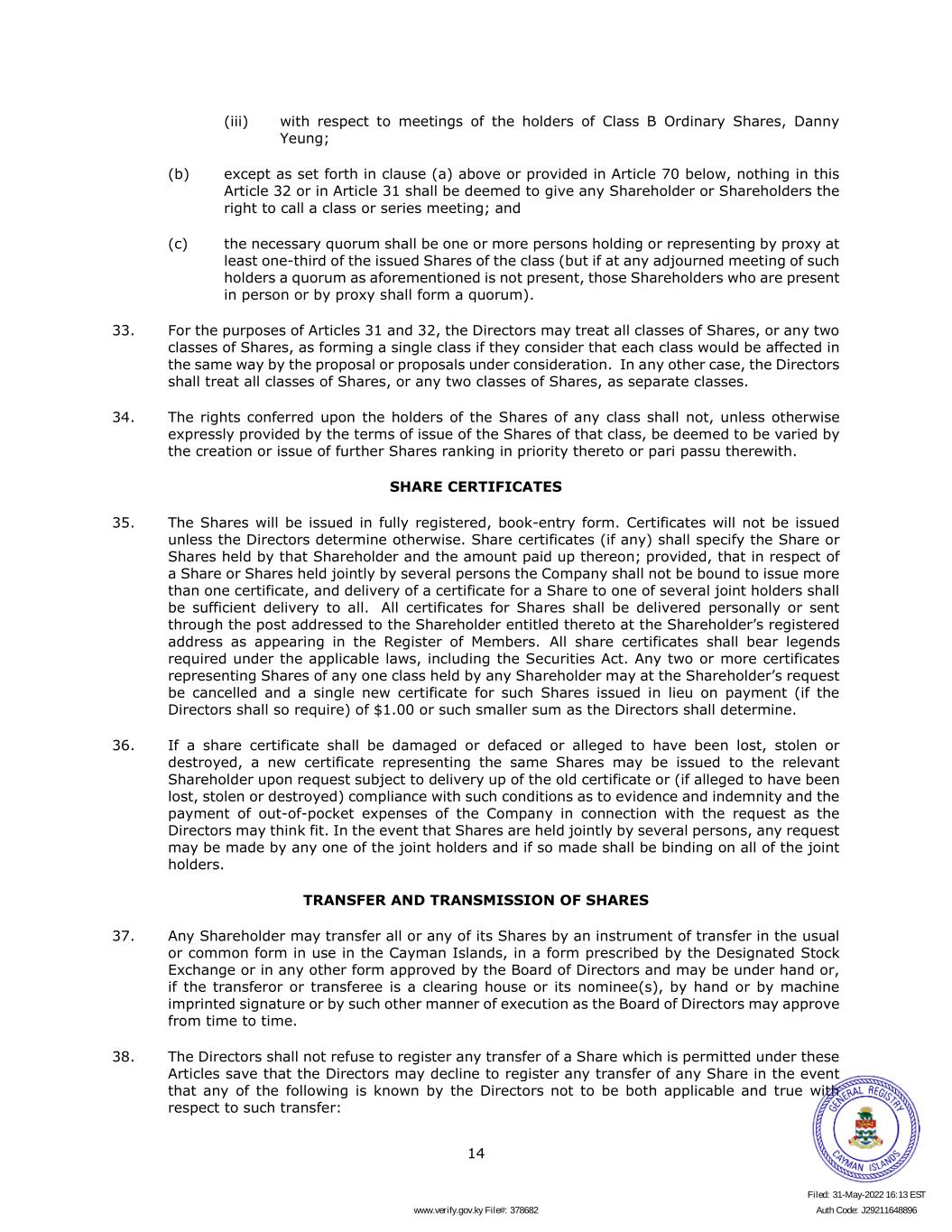 14 (iii) with respect to meetings of the holders of Class B Ordinary Shares, Danny Yeung; (b) except as set forth in clause (a) above or provided in Article 70 below, nothing in this Article 32 or in Article 31 shall be deemed to give any Shareholder or Shareholders the right to call a class or series meeting; and (c) the necessary quorum shall be one or more persons holding or representing by proxy at least one-third of the issued Shares of the class (but if at any adjourned meeting of such holders a quorum as aforementioned is not present, those Shareholders who are present in person or by proxy shall form a quorum). 33. For the purposes of Articles 31 and 32, the Directors may treat all classes of Shares, or any two classes of Shares, as forming a single class if they consider that each class would be affected in the same way by the proposal or proposals under consideration. In any other case, the Directors shall treat all classes of Shares, or any two classes of Shares, as separate classes. 34. The rights conferred upon the holders of the Shares of any class shall not, unless otherwise expressly provided by the terms of issue of the Shares of that class, be deemed to be varied by the creation or issue of further Shares ranking in priority thereto or pari passu therewith. SHARE CERTIFICATES 35. The Shares will be issued in fully registered, book-entry form. Certificates will not be issued unless the Directors determine otherwise. Share certificates (if any) shall specify the Share or Shares held by that Shareholder and the amount paid up thereon; provided, that in respect of a Share or Shares held jointly by several persons the Company shall not be bound to issue more than one certificate, and delivery of a certificate for a Share to one of several joint holders shall be sufficient delivery to all. All certificates for Shares shall be delivered personally or sent through the post addressed to the Shareholder entitled thereto at the Shareholder’s registered address as appearing in the Register of Members. All share certificates shall bear legends required under the applicable laws, including the Securities Act. Any two or more certificates representing Shares of any one class held by any Shareholder may at the Shareholder’s request be cancelled and a single new certificate for such Shares issued in lieu on payment (if the Directors shall so require) of $1.00 or such smaller sum as the Directors shall determine. 36. If a share certificate shall be damaged or defaced or alleged to have been lost, stolen or destroyed, a new certificate representing the same Shares may be issued to the relevant Shareholder upon request subject to delivery up of the old certificate or (if alleged to have been lost, stolen or destroyed) compliance with such conditions as to evidence and indemnity and the payment of out-of-pocket expenses of the Company in connection with the request as the Directors may think fit. In the event that Shares are held jointly by several persons, any request may be made by any one of the joint holders and if so made shall be binding on all of the joint holders. TRANSFER AND TRANSMISSION OF SHARES 37. Any Shareholder may transfer all or any of its Shares by an instrument of transfer in the usual or common form in use in the Cayman Islands, in a form prescribed by the Designated Stock Exchange or in any other form approved by the Board of Directors and may be under hand or, if the transferor or transferee is a clearing house or its nominee(s), by hand or by machine imprinted signature or by such other manner of execution as the Board of Directors may approve from time to time. 38. The Directors shall not refuse to register any transfer of a Share which is permitted under these Articles save that the Directors may decline to register any transfer of any Share in the event that any of the following is known by the Directors not to be both applicable and true with respect to such transfer: Filed: 31-May-2022 16:13 EST Auth Code: J29211648896www.verify.gov.ky File#: 378682