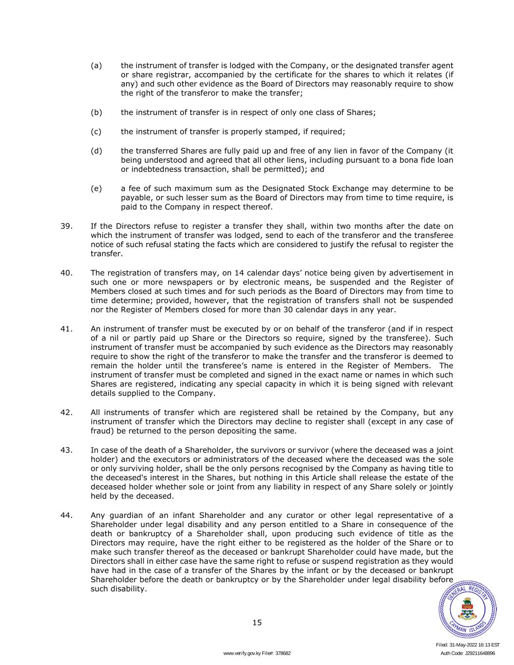 15 (a) the instrument of transfer is lodged with the Company, or the designated transfer agent or share registrar, accompanied by the certificate for the shares to which it relates (if any) and such other evidence as the Board of Directors may reasonably require to show the right of the transferor to make the transfer; (b) the instrument of transfer is in respect of only one class of Shares; (c) the instrument of transfer is properly stamped, if required; (d) the transferred Shares are fully paid up and free of any lien in favor of the Company (it being understood and agreed that all other liens, including pursuant to a bona fide loan or indebtedness transaction, shall be permitted); and (e) a fee of such maximum sum as the Designated Stock Exchange may determine to be payable, or such lesser sum as the Board of Directors may from time to time require, is paid to the Company in respect thereof. 39. If the Directors refuse to register a transfer they shall, within two months after the date on which the instrument of transfer was lodged, send to each of the transferor and the transferee notice of such refusal stating the facts which are considered to justify the refusal to register the transfer. 40. The registration of transfers may, on 14 calendar days’ notice being given by advertisement in such one or more newspapers or by electronic means, be suspended and the Register of Members closed at such times and for such periods as the Board of Directors may from time to time determine; provided, however, that the registration of transfers shall not be suspended nor the Register of Members closed for more than 30 calendar days in any year. 41. An instrument of transfer must be executed by or on behalf of the transferor (and if in respect of a nil or partly paid up Share or the Directors so require, signed by the transferee). Such instrument of transfer must be accompanied by such evidence as the Directors may reasonably require to show the right of the transferor to make the transfer and the transferor is deemed to remain the holder until the transferee’s name is entered in the Register of Members. The instrument of transfer must be completed and signed in the exact name or names in which such Shares are registered, indicating any special capacity in which it is being signed with relevant details supplied to the Company. 42. All instruments of transfer which are registered shall be retained by the Company, but any instrument of transfer which the Directors may decline to register shall (except in any case of fraud) be returned to the person depositing the same. 43. In case of the death of a Shareholder, the survivors or survivor (where the deceased was a joint holder) and the executors or administrators of the deceased where the deceased was the sole or only surviving holder, shall be the only persons recognised by the Company as having title to the deceased's interest in the Shares, but nothing in this Article shall release the estate of the deceased holder whether sole or joint from any liability in respect of any Share solely or jointly held by the deceased. 44. Any guardian of an infant Shareholder and any curator or other legal representative of a Shareholder under legal disability and any person entitled to a Share in consequence of the death or bankruptcy of a Shareholder shall, upon producing such evidence of title as the Directors may require, have the right either to be registered as the holder of the Share or to make such transfer thereof as the deceased or bankrupt Shareholder could have made, but the Directors shall in either case have the same right to refuse or suspend registration as they would have had in the case of a transfer of the Shares by the infant or by the deceased or bankrupt Shareholder before the death or bankruptcy or by the Shareholder under legal disability before such disability. Filed: 31-May-2022 16:13 EST Auth Code: J29211648896www.verify.gov.ky File#: 378682