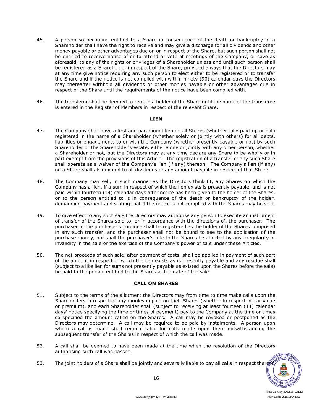 16 45. A person so becoming entitled to a Share in consequence of the death or bankruptcy of a Shareholder shall have the right to receive and may give a discharge for all dividends and other money payable or other advantages due on or in respect of the Share, but such person shall not be entitled to receive notice of or to attend or vote at meetings of the Company, or save as aforesaid, to any of the rights or privileges of a Shareholder unless and until such person shall be registered as a Shareholder in respect of the Share, provided always that the Directors may at any time give notice requiring any such person to elect either to be registered or to transfer the Share and if the notice is not complied with within ninety (90) calendar days the Directors may thereafter withhold all dividends or other monies payable or other advantages due in respect of the Share until the requirements of the notice have been complied with. 46. The transferor shall be deemed to remain a holder of the Share until the name of the transferee is entered in the Register of Members in respect of the relevant Share. LIEN 47. The Company shall have a first and paramount lien on all Shares (whether fully paid-up or not) registered in the name of a Shareholder (whether solely or jointly with others) for all debts, liabilities or engagements to or with the Company (whether presently payable or not) by such Shareholder or the Shareholder's estate, either alone or jointly with any other person, whether a Shareholder or not, but the Directors may at any time declare any Share to be wholly or in part exempt from the provisions of this Article. The registration of a transfer of any such Share shall operate as a waiver of the Company's lien (if any) thereon. The Company's lien (if any) on a Share shall also extend to all dividends or any amount payable in respect of that Share. 48. The Company may sell, in such manner as the Directors think fit, any Shares on which the Company has a lien, if a sum in respect of which the lien exists is presently payable, and is not paid within fourteen (14) calendar days after notice has been given to the holder of the Shares, or to the person entitled to it in consequence of the death or bankruptcy of the holder, demanding payment and stating that if the notice is not complied with the Shares may be sold. 49. To give effect to any such sale the Directors may authorise any person to execute an instrument of transfer of the Shares sold to, or in accordance with the directions of, the purchaser. The purchaser or the purchaser's nominee shall be registered as the holder of the Shares comprised in any such transfer, and the purchaser shall not be bound to see to the application of the purchase money, nor shall the purchaser's title to the Shares be affected by any irregularity or invalidity in the sale or the exercise of the Company's power of sale under these Articles. 50. The net proceeds of such sale, after payment of costs, shall be applied in payment of such part of the amount in respect of which the lien exists as is presently payable and any residue shall (subject to a like lien for sums not presently payable as existed upon the Shares before the sale) be paid to the person entitled to the Shares at the date of the sale. CALL ON SHARES 51. Subject to the terms of the allotment the Directors may from time to time make calls upon the Shareholders in respect of any monies unpaid on their Shares (whether in respect of par value or premium), and each Shareholder shall (subject to receiving at least fourteen (14) calendar days' notice specifying the time or times of payment) pay to the Company at the time or times so specified the amount called on the Shares. A call may be revoked or postponed as the Directors may determine. A call may be required to be paid by instalments. A person upon whom a call is made shall remain liable for calls made upon them notwithstanding the subsequent transfer of the Shares in respect of which the call was made. 52. A call shall be deemed to have been made at the time when the resolution of the Directors authorising such call was passed. 53. The joint holders of a Share shall be jointly and severally liable to pay all calls in respect thereof. Filed: 31-May-2022 16:13 EST Auth Code: J29211648896www.verify.gov.ky File#: 378682