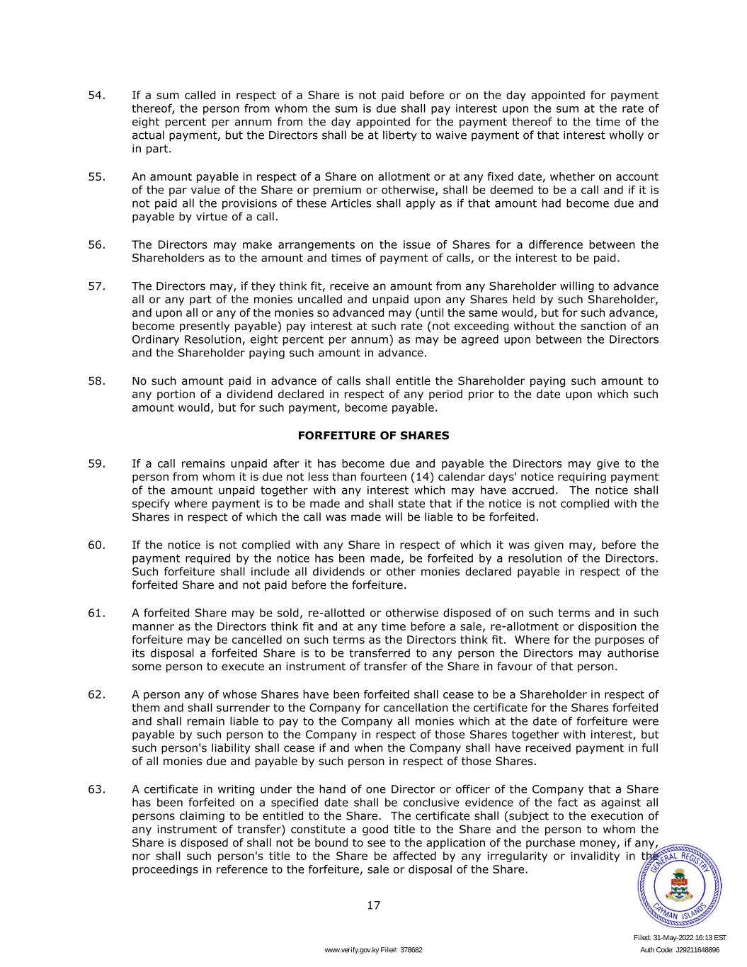 17 54. If a sum called in respect of a Share is not paid before or on the day appointed for payment thereof, the person from whom the sum is due shall pay interest upon the sum at the rate of eight percent per annum from the day appointed for the payment thereof to the time of the actual payment, but the Directors shall be at liberty to waive payment of that interest wholly or in part. 55. An amount payable in respect of a Share on allotment or at any fixed date, whether on account of the par value of the Share or premium or otherwise, shall be deemed to be a call and if it is not paid all the provisions of these Articles shall apply as if that amount had become due and payable by virtue of a call. 56. The Directors may make arrangements on the issue of Shares for a difference between the Shareholders as to the amount and times of payment of calls, or the interest to be paid. 57. The Directors may, if they think fit, receive an amount from any Shareholder willing to advance all or any part of the monies uncalled and unpaid upon any Shares held by such Shareholder, and upon all or any of the monies so advanced may (until the same would, but for such advance, become presently payable) pay interest at such rate (not exceeding without the sanction of an Ordinary Resolution, eight percent per annum) as may be agreed upon between the Directors and the Shareholder paying such amount in advance. 58. No such amount paid in advance of calls shall entitle the Shareholder paying such amount to any portion of a dividend declared in respect of any period prior to the date upon which such amount would, but for such payment, become payable. FORFEITURE OF SHARES 59. If a call remains unpaid after it has become due and payable the Directors may give to the person from whom it is due not less than fourteen (14) calendar days' notice requiring payment of the amount unpaid together with any interest which may have accrued. The notice shall specify where payment is to be made and shall state that if the notice is not complied with the Shares in respect of which the call was made will be liable to be forfeited. 60. If the notice is not complied with any Share in respect of which it was given may, before the payment required by the notice has been made, be forfeited by a resolution of the Directors. Such forfeiture shall include all dividends or other monies declared payable in respect of the forfeited Share and not paid before the forfeiture. 61. A forfeited Share may be sold, re-allotted or otherwise disposed of on such terms and in such manner as the Directors think fit and at any time before a sale, re-allotment or disposition the forfeiture may be cancelled on such terms as the Directors think fit. Where for the purposes of its disposal a forfeited Share is to be transferred to any person the Directors may authorise some person to execute an instrument of transfer of the Share in favour of that person. 62. A person any of whose Shares have been forfeited shall cease to be a Shareholder in respect of them and shall surrender to the Company for cancellation the certificate for the Shares forfeited and shall remain liable to pay to the Company all monies which at the date of forfeiture were payable by such person to the Company in respect of those Shares together with interest, but such person's liability shall cease if and when the Company shall have received payment in full of all monies due and payable by such person in respect of those Shares. 63. A certificate in writing under the hand of one Director or officer of the Company that a Share has been forfeited on a specified date shall be conclusive evidence of the fact as against all persons claiming to be entitled to the Share. The certificate shall (subject to the execution of any instrument of transfer) constitute a good title to the Share and the person to whom the Share is disposed of shall not be bound to see to the application of the purchase money, if any, nor shall such person's title to the Share be affected by any irregularity or invalidity in the proceedings in reference to the forfeiture, sale or disposal of the Share. Filed: 31-May-2022 16:13 EST Auth Code: J29211648896www.verify.gov.ky File#: 378682