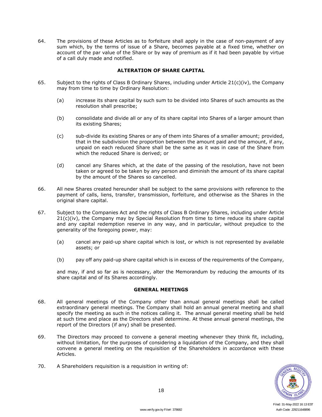 18 64. The provisions of these Articles as to forfeiture shall apply in the case of non-payment of any sum which, by the terms of issue of a Share, becomes payable at a fixed time, whether on account of the par value of the Share or by way of premium as if it had been payable by virtue of a call duly made and notified. ALTERATION OF SHARE CAPITAL 65. Subject to the rights of Class B Ordinary Shares, including under Article 21(c)(iv), the Company may from time to time by Ordinary Resolution: (a) increase its share capital by such sum to be divided into Shares of such amounts as the resolution shall prescribe; (b) consolidate and divide all or any of its share capital into Shares of a larger amount than its existing Shares; (c) sub-divide its existing Shares or any of them into Shares of a smaller amount; provided, that in the subdivision the proportion between the amount paid and the amount, if any, unpaid on each reduced Share shall be the same as it was in case of the Share from which the reduced Share is derived; or (d) cancel any Shares which, at the date of the passing of the resolution, have not been taken or agreed to be taken by any person and diminish the amount of its share capital by the amount of the Shares so cancelled. 66. All new Shares created hereunder shall be subject to the same provisions with reference to the payment of calls, liens, transfer, transmission, forfeiture, and otherwise as the Shares in the original share capital. 67. Subject to the Companies Act and the rights of Class B Ordinary Shares, including under Article 21(c)(iv), the Company may by Special Resolution from time to time reduce its share capital and any capital redemption reserve in any way, and in particular, without prejudice to the generality of the foregoing power, may: (a) cancel any paid-up share capital which is lost, or which is not represented by available assets; or (b) pay off any paid-up share capital which is in excess of the requirements of the Company, and may, if and so far as is necessary, alter the Memorandum by reducing the amounts of its share capital and of its Shares accordingly. GENERAL MEETINGS 68. All general meetings of the Company other than annual general meetings shall be called extraordinary general meetings. The Company shall hold an annual general meeting and shall specify the meeting as such in the notices calling it. The annual general meeting shall be held at such time and place as the Directors shall determine. At these annual general meetings, the report of the Directors (if any) shall be presented. 69. The Directors may proceed to convene a general meeting whenever they think fit, including, without limitation, for the purposes of considering a liquidation of the Company, and they shall convene a general meeting on the requisition of the Shareholders in accordance with these Articles. 70. A Shareholders requisition is a requisition in writing of: Filed: 31-May-2022 16:13 EST Auth Code: J29211648896www.verify.gov.ky File#: 378682