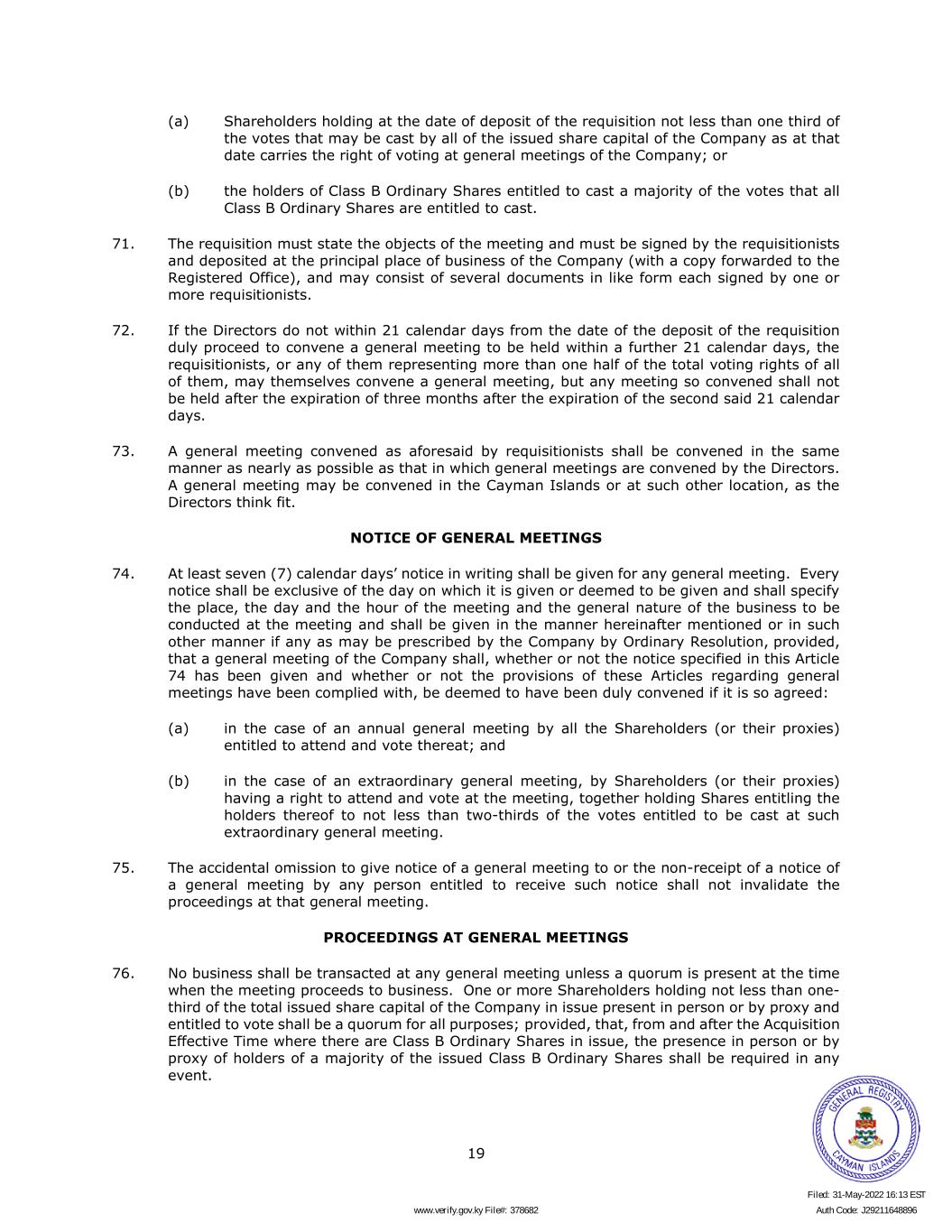 19 (a) Shareholders holding at the date of deposit of the requisition not less than one third of the votes that may be cast by all of the issued share capital of the Company as at that date carries the right of voting at general meetings of the Company; or (b) the holders of Class B Ordinary Shares entitled to cast a majority of the votes that all Class B Ordinary Shares are entitled to cast. 71. The requisition must state the objects of the meeting and must be signed by the requisitionists and deposited at the principal place of business of the Company (with a copy forwarded to the Registered Office), and may consist of several documents in like form each signed by one or more requisitionists. 72. If the Directors do not within 21 calendar days from the date of the deposit of the requisition duly proceed to convene a general meeting to be held within a further 21 calendar days, the requisitionists, or any of them representing more than one half of the total voting rights of all of them, may themselves convene a general meeting, but any meeting so convened shall not be held after the expiration of three months after the expiration of the second said 21 calendar days. 73. A general meeting convened as aforesaid by requisitionists shall be convened in the same manner as nearly as possible as that in which general meetings are convened by the Directors. A general meeting may be convened in the Cayman Islands or at such other location, as the Directors think fit. NOTICE OF GENERAL MEETINGS 74. At least seven (7) calendar days’ notice in writing shall be given for any general meeting. Every notice shall be exclusive of the day on which it is given or deemed to be given and shall specify the place, the day and the hour of the meeting and the general nature of the business to be conducted at the meeting and shall be given in the manner hereinafter mentioned or in such other manner if any as may be prescribed by the Company by Ordinary Resolution, provided, that a general meeting of the Company shall, whether or not the notice specified in this Article 74 has been given and whether or not the provisions of these Articles regarding general meetings have been complied with, be deemed to have been duly convened if it is so agreed: (a) in the case of an annual general meeting by all the Shareholders (or their proxies) entitled to attend and vote thereat; and (b) in the case of an extraordinary general meeting, by Shareholders (or their proxies) having a right to attend and vote at the meeting, together holding Shares entitling the holders thereof to not less than two-thirds of the votes entitled to be cast at such extraordinary general meeting. 75. The accidental omission to give notice of a general meeting to or the non-receipt of a notice of a general meeting by any person entitled to receive such notice shall not invalidate the proceedings at that general meeting. PROCEEDINGS AT GENERAL MEETINGS 76. No business shall be transacted at any general meeting unless a quorum is present at the time when the meeting proceeds to business. One or more Shareholders holding not less than one- third of the total issued share capital of the Company in issue present in person or by proxy and entitled to vote shall be a quorum for all purposes; provided, that, from and after the Acquisition Effective Time where there are Class B Ordinary Shares in issue, the presence in person or by proxy of holders of a majority of the issued Class B Ordinary Shares shall be required in any event. Filed: 31-May-2022 16:13 EST Auth Code: J29211648896www.verify.gov.ky File#: 378682