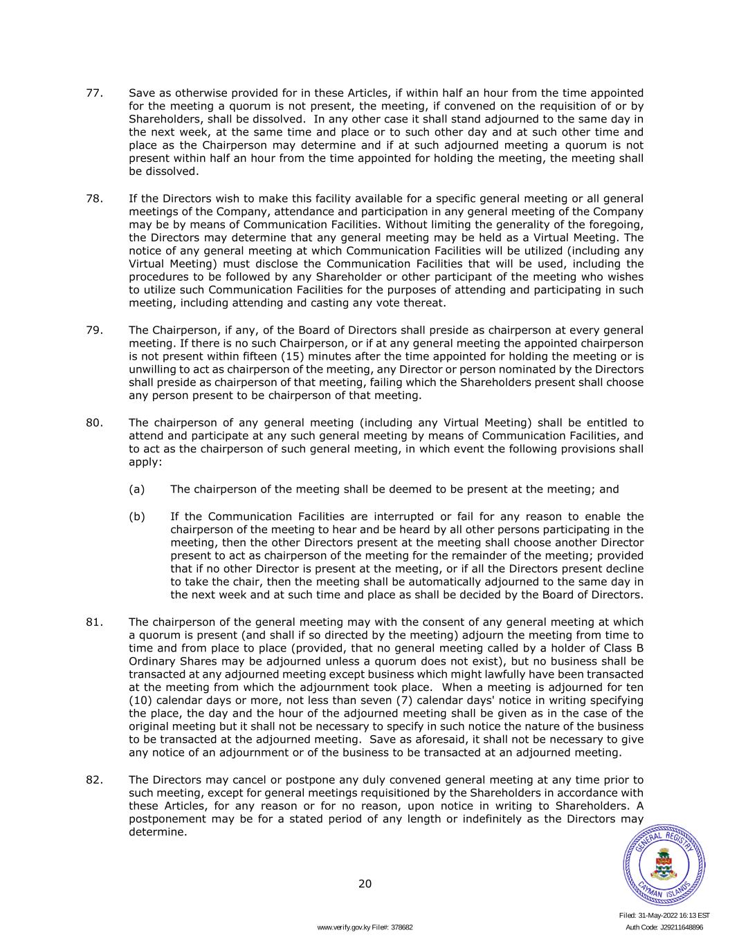 20 77. Save as otherwise provided for in these Articles, if within half an hour from the time appointed for the meeting a quorum is not present, the meeting, if convened on the requisition of or by Shareholders, shall be dissolved. In any other case it shall stand adjourned to the same day in the next week, at the same time and place or to such other day and at such other time and place as the Chairperson may determine and if at such adjourned meeting a quorum is not present within half an hour from the time appointed for holding the meeting, the meeting shall be dissolved. 78. If the Directors wish to make this facility available for a specific general meeting or all general meetings of the Company, attendance and participation in any general meeting of the Company may be by means of Communication Facilities. Without limiting the generality of the foregoing, the Directors may determine that any general meeting may be held as a Virtual Meeting. The notice of any general meeting at which Communication Facilities will be utilized (including any Virtual Meeting) must disclose the Communication Facilities that will be used, including the procedures to be followed by any Shareholder or other participant of the meeting who wishes to utilize such Communication Facilities for the purposes of attending and participating in such meeting, including attending and casting any vote thereat. 79. The Chairperson, if any, of the Board of Directors shall preside as chairperson at every general meeting. If there is no such Chairperson, or if at any general meeting the appointed chairperson is not present within fifteen (15) minutes after the time appointed for holding the meeting or is unwilling to act as chairperson of the meeting, any Director or person nominated by the Directors shall preside as chairperson of that meeting, failing which the Shareholders present shall choose any person present to be chairperson of that meeting. 80. The chairperson of any general meeting (including any Virtual Meeting) shall be entitled to attend and participate at any such general meeting by means of Communication Facilities, and to act as the chairperson of such general meeting, in which event the following provisions shall apply: (a) The chairperson of the meeting shall be deemed to be present at the meeting; and (b) If the Communication Facilities are interrupted or fail for any reason to enable the chairperson of the meeting to hear and be heard by all other persons participating in the meeting, then the other Directors present at the meeting shall choose another Director present to act as chairperson of the meeting for the remainder of the meeting; provided that if no other Director is present at the meeting, or if all the Directors present decline to take the chair, then the meeting shall be automatically adjourned to the same day in the next week and at such time and place as shall be decided by the Board of Directors. 81. The chairperson of the general meeting may with the consent of any general meeting at which a quorum is present (and shall if so directed by the meeting) adjourn the meeting from time to time and from place to place (provided, that no general meeting called by a holder of Class B Ordinary Shares may be adjourned unless a quorum does not exist), but no business shall be transacted at any adjourned meeting except business which might lawfully have been transacted at the meeting from which the adjournment took place. When a meeting is adjourned for ten (10) calendar days or more, not less than seven (7) calendar days' notice in writing specifying the place, the day and the hour of the adjourned meeting shall be given as in the case of the original meeting but it shall not be necessary to specify in such notice the nature of the business to be transacted at the adjourned meeting. Save as aforesaid, it shall not be necessary to give any notice of an adjournment or of the business to be transacted at an adjourned meeting. 82. The Directors may cancel or postpone any duly convened general meeting at any time prior to such meeting, except for general meetings requisitioned by the Shareholders in accordance with these Articles, for any reason or for no reason, upon notice in writing to Shareholders. A postponement may be for a stated period of any length or indefinitely as the Directors may determine. Filed: 31-May-2022 16:13 EST Auth Code: J29211648896www.verify.gov.ky File#: 378682
