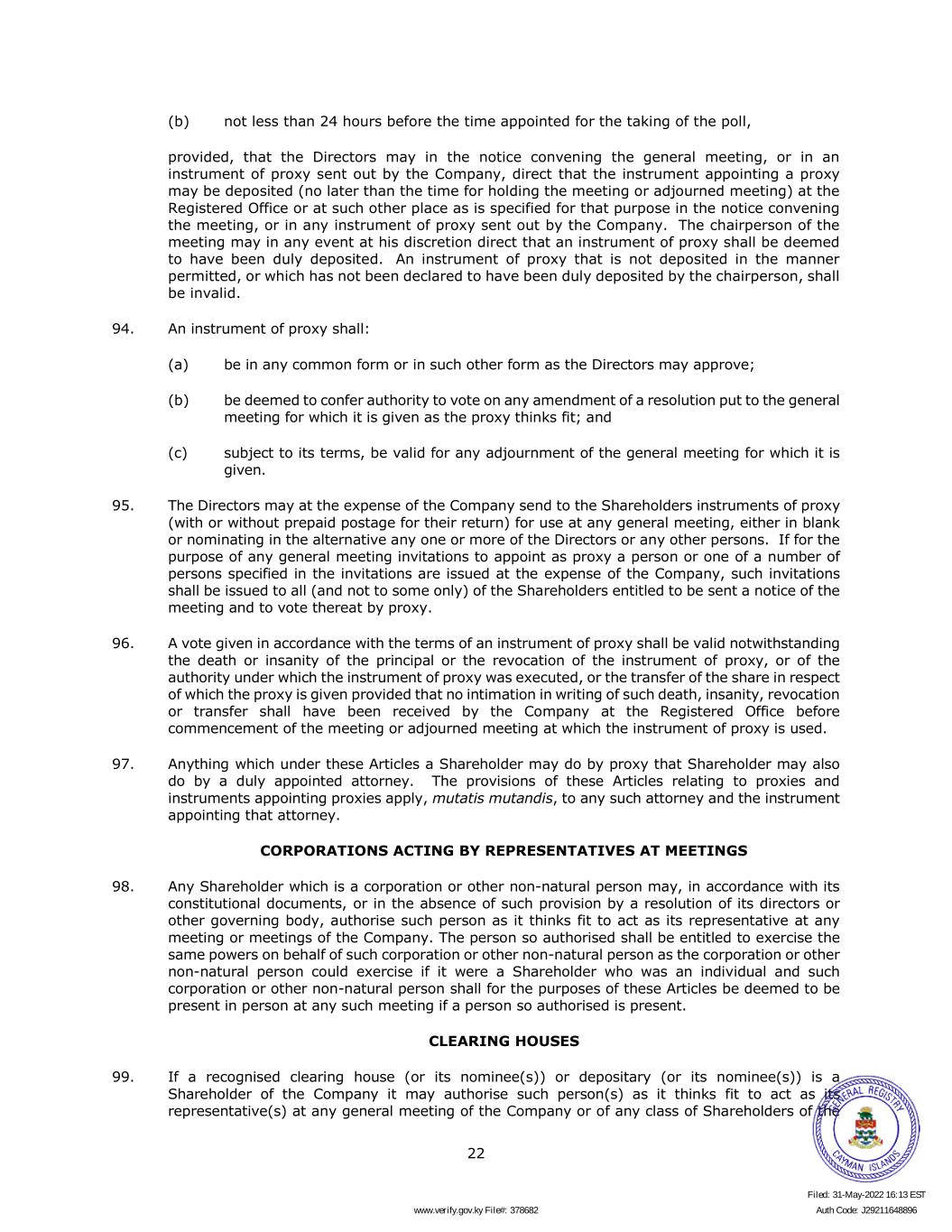 22 (b) not less than 24 hours before the time appointed for the taking of the poll, provided, that the Directors may in the notice convening the general meeting, or in an instrument of proxy sent out by the Company, direct that the instrument appointing a proxy may be deposited (no later than the time for holding the meeting or adjourned meeting) at the Registered Office or at such other place as is specified for that purpose in the notice convening the meeting, or in any instrument of proxy sent out by the Company. The chairperson of the meeting may in any event at his discretion direct that an instrument of proxy shall be deemed to have been duly deposited. An instrument of proxy that is not deposited in the manner permitted, or which has not been declared to have been duly deposited by the chairperson, shall be invalid. 94. An instrument of proxy shall: (a) be in any common form or in such other form as the Directors may approve; (b) be deemed to confer authority to vote on any amendment of a resolution put to the general meeting for which it is given as the proxy thinks fit; and (c) subject to its terms, be valid for any adjournment of the general meeting for which it is given. 95. The Directors may at the expense of the Company send to the Shareholders instruments of proxy (with or without prepaid postage for their return) for use at any general meeting, either in blank or nominating in the alternative any one or more of the Directors or any other persons. If for the purpose of any general meeting invitations to appoint as proxy a person or one of a number of persons specified in the invitations are issued at the expense of the Company, such invitations shall be issued to all (and not to some only) of the Shareholders entitled to be sent a notice of the meeting and to vote thereat by proxy. 96. A vote given in accordance with the terms of an instrument of proxy shall be valid notwithstanding the death or insanity of the principal or the revocation of the instrument of proxy, or of the authority under which the instrument of proxy was executed, or the transfer of the share in respect of which the proxy is given provided that no intimation in writing of such death, insanity, revocation or transfer shall have been received by the Company at the Registered Office before commencement of the meeting or adjourned meeting at which the instrument of proxy is used. 97. Anything which under these Articles a Shareholder may do by proxy that Shareholder may also do by a duly appointed attorney. The provisions of these Articles relating to proxies and instruments appointing proxies apply, mutatis mutandis, to any such attorney and the instrument appointing that attorney. CORPORATIONS ACTING BY REPRESENTATIVES AT MEETINGS 98. Any Shareholder which is a corporation or other non-natural person may, in accordance with its constitutional documents, or in the absence of such provision by a resolution of its directors or other governing body, authorise such person as it thinks fit to act as its representative at any meeting or meetings of the Company. The person so authorised shall be entitled to exercise the same powers on behalf of such corporation or other non-natural person as the corporation or other non-natural person could exercise if it were a Shareholder who was an individual and such corporation or other non-natural person shall for the purposes of these Articles be deemed to be present in person at any such meeting if a person so authorised is present. CLEARING HOUSES 99. If a recognised clearing house (or its nominee(s)) or depositary (or its nominee(s)) is a Shareholder of the Company it may authorise such person(s) as it thinks fit to act as its representative(s) at any general meeting of the Company or of any class of Shareholders of the Filed: 31-May-2022 16:13 EST Auth Code: J29211648896www.verify.gov.ky File#: 378682