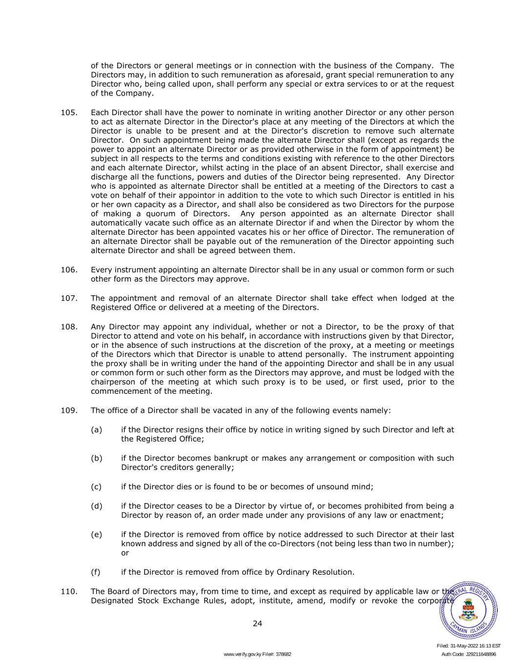 24 of the Directors or general meetings or in connection with the business of the Company. The Directors may, in addition to such remuneration as aforesaid, grant special remuneration to any Director who, being called upon, shall perform any special or extra services to or at the request of the Company. 105. Each Director shall have the power to nominate in writing another Director or any other person to act as alternate Director in the Director's place at any meeting of the Directors at which the Director is unable to be present and at the Director's discretion to remove such alternate Director. On such appointment being made the alternate Director shall (except as regards the power to appoint an alternate Director or as provided otherwise in the form of appointment) be subject in all respects to the terms and conditions existing with reference to the other Directors and each alternate Director, whilst acting in the place of an absent Director, shall exercise and discharge all the functions, powers and duties of the Director being represented. Any Director who is appointed as alternate Director shall be entitled at a meeting of the Directors to cast a vote on behalf of their appointor in addition to the vote to which such Director is entitled in his or her own capacity as a Director, and shall also be considered as two Directors for the purpose of making a quorum of Directors. Any person appointed as an alternate Director shall automatically vacate such office as an alternate Director if and when the Director by whom the alternate Director has been appointed vacates his or her office of Director. The remuneration of an alternate Director shall be payable out of the remuneration of the Director appointing such alternate Director and shall be agreed between them. 106. Every instrument appointing an alternate Director shall be in any usual or common form or such other form as the Directors may approve. 107. The appointment and removal of an alternate Director shall take effect when lodged at the Registered Office or delivered at a meeting of the Directors. 108. Any Director may appoint any individual, whether or not a Director, to be the proxy of that Director to attend and vote on his behalf, in accordance with instructions given by that Director, or in the absence of such instructions at the discretion of the proxy, at a meeting or meetings of the Directors which that Director is unable to attend personally. The instrument appointing the proxy shall be in writing under the hand of the appointing Director and shall be in any usual or common form or such other form as the Directors may approve, and must be lodged with the chairperson of the meeting at which such proxy is to be used, or first used, prior to the commencement of the meeting. 109. The office of a Director shall be vacated in any of the following events namely: (a) if the Director resigns their office by notice in writing signed by such Director and left at the Registered Office; (b) if the Director becomes bankrupt or makes any arrangement or composition with such Director's creditors generally; (c) if the Director dies or is found to be or becomes of unsound mind; (d) if the Director ceases to be a Director by virtue of, or becomes prohibited from being a Director by reason of, an order made under any provisions of any law or enactment; (e) if the Director is removed from office by notice addressed to such Director at their last known address and signed by all of the co-Directors (not being less than two in number); or (f) if the Director is removed from office by Ordinary Resolution. 110. The Board of Directors may, from time to time, and except as required by applicable law or the Designated Stock Exchange Rules, adopt, institute, amend, modify or revoke the corporate Filed: 31-May-2022 16:13 EST Auth Code: J29211648896www.verify.gov.ky File#: 378682