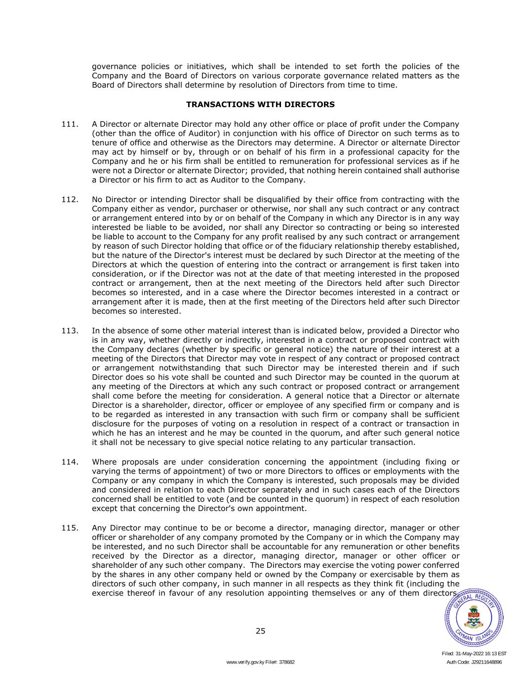 25 governance policies or initiatives, which shall be intended to set forth the policies of the Company and the Board of Directors on various corporate governance related matters as the Board of Directors shall determine by resolution of Directors from time to time. TRANSACTIONS WITH DIRECTORS 111. A Director or alternate Director may hold any other office or place of profit under the Company (other than the office of Auditor) in conjunction with his office of Director on such terms as to tenure of office and otherwise as the Directors may determine. A Director or alternate Director may act by himself or by, through or on behalf of his firm in a professional capacity for the Company and he or his firm shall be entitled to remuneration for professional services as if he were not a Director or alternate Director; provided, that nothing herein contained shall authorise a Director or his firm to act as Auditor to the Company. 112. No Director or intending Director shall be disqualified by their office from contracting with the Company either as vendor, purchaser or otherwise, nor shall any such contract or any contract or arrangement entered into by or on behalf of the Company in which any Director is in any way interested be liable to be avoided, nor shall any Director so contracting or being so interested be liable to account to the Company for any profit realised by any such contract or arrangement by reason of such Director holding that office or of the fiduciary relationship thereby established, but the nature of the Director's interest must be declared by such Director at the meeting of the Directors at which the question of entering into the contract or arrangement is first taken into consideration, or if the Director was not at the date of that meeting interested in the proposed contract or arrangement, then at the next meeting of the Directors held after such Director becomes so interested, and in a case where the Director becomes interested in a contract or arrangement after it is made, then at the first meeting of the Directors held after such Director becomes so interested. 113. In the absence of some other material interest than is indicated below, provided a Director who is in any way, whether directly or indirectly, interested in a contract or proposed contract with the Company declares (whether by specific or general notice) the nature of their interest at a meeting of the Directors that Director may vote in respect of any contract or proposed contract or arrangement notwithstanding that such Director may be interested therein and if such Director does so his vote shall be counted and such Director may be counted in the quorum at any meeting of the Directors at which any such contract or proposed contract or arrangement shall come before the meeting for consideration. A general notice that a Director or alternate Director is a shareholder, director, officer or employee of any specified firm or company and is to be regarded as interested in any transaction with such firm or company shall be sufficient disclosure for the purposes of voting on a resolution in respect of a contract or transaction in which he has an interest and he may be counted in the quorum, and after such general notice it shall not be necessary to give special notice relating to any particular transaction. 114. Where proposals are under consideration concerning the appointment (including fixing or varying the terms of appointment) of two or more Directors to offices or employments with the Company or any company in which the Company is interested, such proposals may be divided and considered in relation to each Director separately and in such cases each of the Directors concerned shall be entitled to vote (and be counted in the quorum) in respect of each resolution except that concerning the Director's own appointment. 115. Any Director may continue to be or become a director, managing director, manager or other officer or shareholder of any company promoted by the Company or in which the Company may be interested, and no such Director shall be accountable for any remuneration or other benefits received by the Director as a director, managing director, manager or other officer or shareholder of any such other company. The Directors may exercise the voting power conferred by the shares in any other company held or owned by the Company or exercisable by them as directors of such other company, in such manner in all respects as they think fit (including the exercise thereof in favour of any resolution appointing themselves or any of them directors, Filed: 31-May-2022 16:13 EST Auth Code: J29211648896www.verify.gov.ky File#: 378682