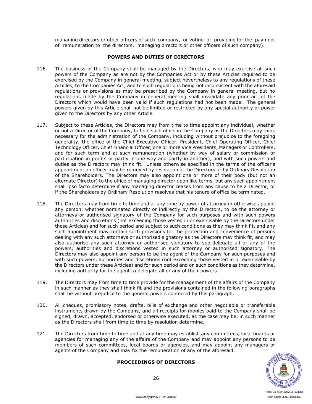 26 managing directors or other officers of such company, or voting or providing for the payment of remuneration to the directors, managing directors or other officers of such company). POWERS AND DUTIES OF DIRECTORS 116. The business of the Company shall be managed by the Directors, who may exercise all such powers of the Company as are not by the Companies Act or by these Articles required to be exercised by the Company in general meeting, subject nevertheless to any regulations of these Articles, to the Companies Act, and to such regulations being not inconsistent with the aforesaid regulations or provisions as may be prescribed by the Company in general meeting, but no regulations made by the Company in general meeting shall invalidate any prior act of the Directors which would have been valid if such regulations had not been made. The general powers given by this Article shall not be limited or restricted by any special authority or power given to the Directors by any other Article. 117. Subject to these Articles, the Directors may from time to time appoint any individual, whether or not a Director of the Company, to hold such office in the Company as the Directors may think necessary for the administration of the Company, including without prejudice to the foregoing generality, the office of the Chief Executive Officer, President, Chief Operating Officer, Chief Technology Officer, Chief Financial Officer, one or more Vice Presidents, Managers or Controllers, and for such term and at such remuneration (whether by way of salary or commission or participation in profits or partly in one way and partly in another), and with such powers and duties as the Directors may think fit. Unless otherwise specified in the terms of the officer's appointment an officer may be removed by resolution of the Directors or by Ordinary Resolution of the Shareholders. The Directors may also appoint one or more of their body (but not an alternate Director) to the office of managing director upon like terms, but any such appointment shall ipso facto determine if any managing director ceases from any cause to be a Director, or if the Shareholders by Ordinary Resolution resolves that his tenure of office be terminated. 118. The Directors may from time to time and at any time by power of attorney or otherwise appoint any person, whether nominated directly or indirectly by the Directors, to be the attorney or attorneys or authorised signatory of the Company for such purposes and with such powers authorities and discretions (not exceeding those vested in or exercisable by the Directors under these Articles) and for such period and subject to such conditions as they may think fit, and any such appointment may contain such provisions for the protection and convenience of persons dealing with any such attorneys or authorised signatory as the Directors may think fit, and may also authorise any such attorney or authorised signatory to sub-delegate all or any of the powers, authorities and discretions vested in such attorney or authorised signatory. The Directors may also appoint any person to be the agent of the Company for such purposes and with such powers, authorities and discretions (not exceeding those vested in or exercisable by the Directors under these Articles) and for such period and on such conditions as they determine, including authority for the agent to delegate all or any of their powers. 119. The Directors may from time to time provide for the management of the affairs of the Company in such manner as they shall think fit and the provisions contained in the following paragraphs shall be without prejudice to the general powers conferred by this paragraph. 120. All cheques, promissory notes, drafts, bills of exchange and other negotiable or transferable instruments drawn by the Company, and all receipts for monies paid to the Company shall be signed, drawn, accepted, endorsed or otherwise executed, as the case may be, in such manner as the Directors shall from time to time by resolution determine. 121. The Directors from time to time and at any time may establish any committees, local boards or agencies for managing any of the affairs of the Company and may appoint any persons to be members of such committees, local boards or agencies, and may appoint any managers or agents of the Company and may fix the remuneration of any of the aforesaid. PROCEEDINGS OF DIRECTORS Filed: 31-May-2022 16:13 EST Auth Code: J29211648896www.verify.gov.ky File#: 378682