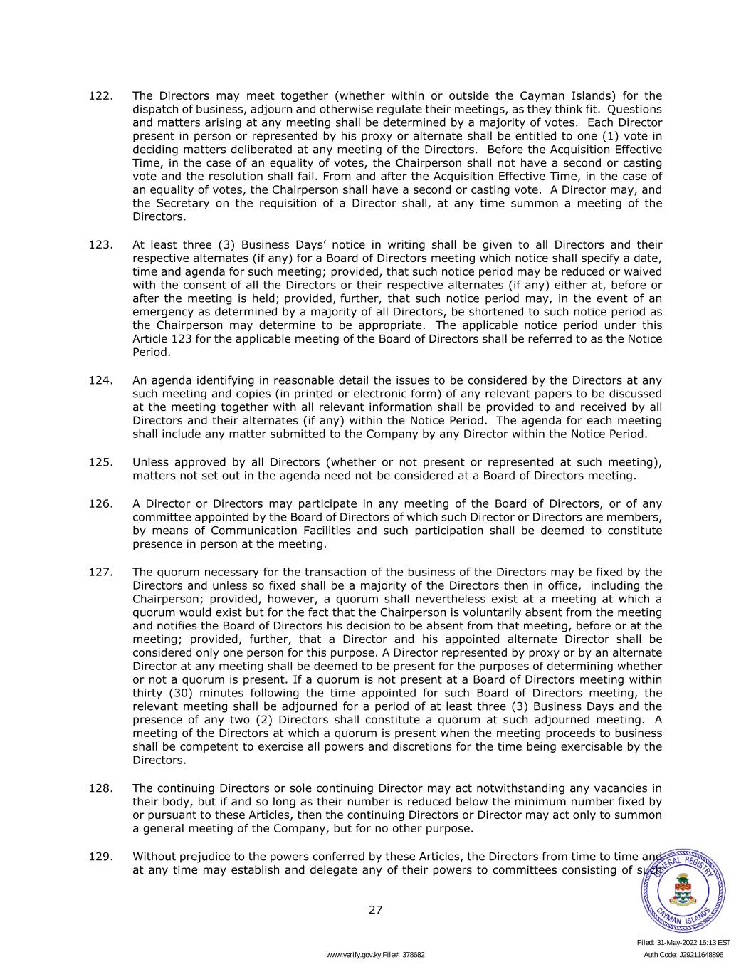27 122. The Directors may meet together (whether within or outside the Cayman Islands) for the dispatch of business, adjourn and otherwise regulate their meetings, as they think fit. Questions and matters arising at any meeting shall be determined by a majority of votes. Each Director present in person or represented by his proxy or alternate shall be entitled to one (1) vote in deciding matters deliberated at any meeting of the Directors. Before the Acquisition Effective Time, in the case of an equality of votes, the Chairperson shall not have a second or casting vote and the resolution shall fail. From and after the Acquisition Effective Time, in the case of an equality of votes, the Chairperson shall have a second or casting vote. A Director may, and the Secretary on the requisition of a Director shall, at any time summon a meeting of the Directors. 123. At least three (3) Business Days’ notice in writing shall be given to all Directors and their respective alternates (if any) for a Board of Directors meeting which notice shall specify a date, time and agenda for such meeting; provided, that such notice period may be reduced or waived with the consent of all the Directors or their respective alternates (if any) either at, before or after the meeting is held; provided, further, that such notice period may, in the event of an emergency as determined by a majority of all Directors, be shortened to such notice period as the Chairperson may determine to be appropriate. The applicable notice period under this Article 123 for the applicable meeting of the Board of Directors shall be referred to as the Notice Period. 124. An agenda identifying in reasonable detail the issues to be considered by the Directors at any such meeting and copies (in printed or electronic form) of any relevant papers to be discussed at the meeting together with all relevant information shall be provided to and received by all Directors and their alternates (if any) within the Notice Period. The agenda for each meeting shall include any matter submitted to the Company by any Director within the Notice Period. 125. Unless approved by all Directors (whether or not present or represented at such meeting), matters not set out in the agenda need not be considered at a Board of Directors meeting. 126. A Director or Directors may participate in any meeting of the Board of Directors, or of any committee appointed by the Board of Directors of which such Director or Directors are members, by means of Communication Facilities and such participation shall be deemed to constitute presence in person at the meeting. 127. The quorum necessary for the transaction of the business of the Directors may be fixed by the Directors and unless so fixed shall be a majority of the Directors then in office, including the Chairperson; provided, however, a quorum shall nevertheless exist at a meeting at which a quorum would exist but for the fact that the Chairperson is voluntarily absent from the meeting and notifies the Board of Directors his decision to be absent from that meeting, before or at the meeting; provided, further, that a Director and his appointed alternate Director shall be considered only one person for this purpose. A Director represented by proxy or by an alternate Director at any meeting shall be deemed to be present for the purposes of determining whether or not a quorum is present. If a quorum is not present at a Board of Directors meeting within thirty (30) minutes following the time appointed for such Board of Directors meeting, the relevant meeting shall be adjourned for a period of at least three (3) Business Days and the presence of any two (2) Directors shall constitute a quorum at such adjourned meeting. A meeting of the Directors at which a quorum is present when the meeting proceeds to business shall be competent to exercise all powers and discretions for the time being exercisable by the Directors. 128. The continuing Directors or sole continuing Director may act notwithstanding any vacancies in their body, but if and so long as their number is reduced below the minimum number fixed by or pursuant to these Articles, then the continuing Directors or Director may act only to summon a general meeting of the Company, but for no other purpose. 129. Without prejudice to the powers conferred by these Articles, the Directors from time to time and at any time may establish and delegate any of their powers to committees consisting of such Filed: 31-May-2022 16:13 EST Auth Code: J29211648896www.verify.gov.ky File#: 378682