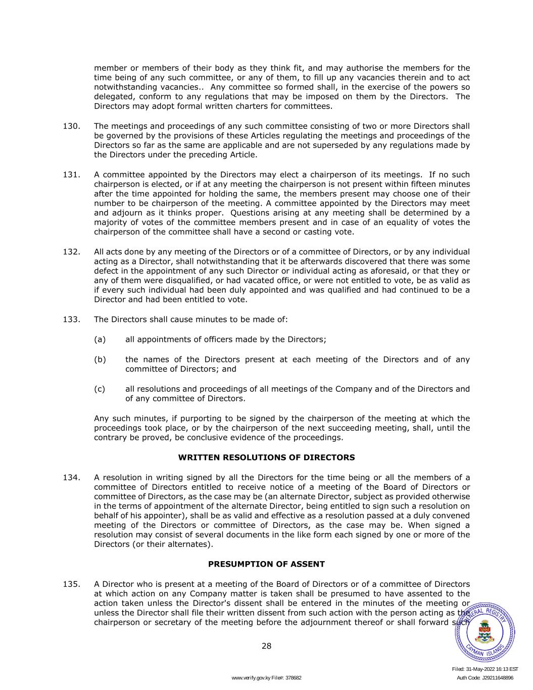 28 member or members of their body as they think fit, and may authorise the members for the time being of any such committee, or any of them, to fill up any vacancies therein and to act notwithstanding vacancies.. Any committee so formed shall, in the exercise of the powers so delegated, conform to any regulations that may be imposed on them by the Directors. The Directors may adopt formal written charters for committees. 130. The meetings and proceedings of any such committee consisting of two or more Directors shall be governed by the provisions of these Articles regulating the meetings and proceedings of the Directors so far as the same are applicable and are not superseded by any regulations made by the Directors under the preceding Article. 131. A committee appointed by the Directors may elect a chairperson of its meetings. If no such chairperson is elected, or if at any meeting the chairperson is not present within fifteen minutes after the time appointed for holding the same, the members present may choose one of their number to be chairperson of the meeting. A committee appointed by the Directors may meet and adjourn as it thinks proper. Questions arising at any meeting shall be determined by a majority of votes of the committee members present and in case of an equality of votes the chairperson of the committee shall have a second or casting vote. 132. All acts done by any meeting of the Directors or of a committee of Directors, or by any individual acting as a Director, shall notwithstanding that it be afterwards discovered that there was some defect in the appointment of any such Director or individual acting as aforesaid, or that they or any of them were disqualified, or had vacated office, or were not entitled to vote, be as valid as if every such individual had been duly appointed and was qualified and had continued to be a Director and had been entitled to vote. 133. The Directors shall cause minutes to be made of: (a) all appointments of officers made by the Directors; (b) the names of the Directors present at each meeting of the Directors and of any committee of Directors; and (c) all resolutions and proceedings of all meetings of the Company and of the Directors and of any committee of Directors. Any such minutes, if purporting to be signed by the chairperson of the meeting at which the proceedings took place, or by the chairperson of the next succeeding meeting, shall, until the contrary be proved, be conclusive evidence of the proceedings. WRITTEN RESOLUTIONS OF DIRECTORS 134. A resolution in writing signed by all the Directors for the time being or all the members of a committee of Directors entitled to receive notice of a meeting of the Board of Directors or committee of Directors, as the case may be (an alternate Director, subject as provided otherwise in the terms of appointment of the alternate Director, being entitled to sign such a resolution on behalf of his appointer), shall be as valid and effective as a resolution passed at a duly convened meeting of the Directors or committee of Directors, as the case may be. When signed a resolution may consist of several documents in the like form each signed by one or more of the Directors (or their alternates). PRESUMPTION OF ASSENT 135. A Director who is present at a meeting of the Board of Directors or of a committee of Directors at which action on any Company matter is taken shall be presumed to have assented to the action taken unless the Director's dissent shall be entered in the minutes of the meeting or unless the Director shall file their written dissent from such action with the person acting as the chairperson or secretary of the meeting before the adjournment thereof or shall forward such Filed: 31-May-2022 16:13 EST Auth Code: J29211648896www.verify.gov.ky File#: 378682