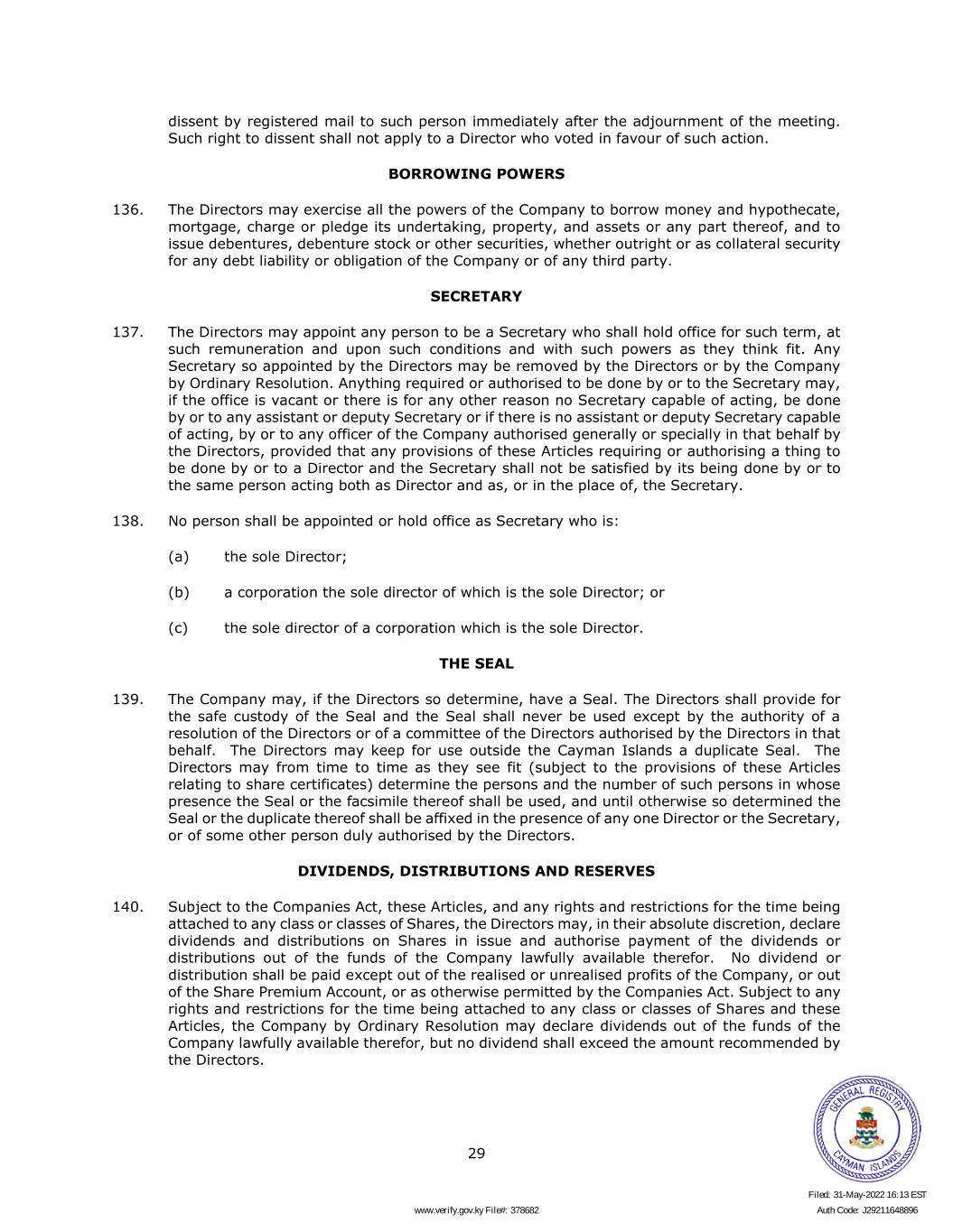 29 dissent by registered mail to such person immediately after the adjournment of the meeting. Such right to dissent shall not apply to a Director who voted in favour of such action. BORROWING POWERS 136. The Directors may exercise all the powers of the Company to borrow money and hypothecate, mortgage, charge or pledge its undertaking, property, and assets or any part thereof, and to issue debentures, debenture stock or other securities, whether outright or as collateral security for any debt liability or obligation of the Company or of any third party. SECRETARY 137. The Directors may appoint any person to be a Secretary who shall hold office for such term, at such remuneration and upon such conditions and with such powers as they think fit. Any Secretary so appointed by the Directors may be removed by the Directors or by the Company by Ordinary Resolution. Anything required or authorised to be done by or to the Secretary may, if the office is vacant or there is for any other reason no Secretary capable of acting, be done by or to any assistant or deputy Secretary or if there is no assistant or deputy Secretary capable of acting, by or to any officer of the Company authorised generally or specially in that behalf by the Directors, provided that any provisions of these Articles requiring or authorising a thing to be done by or to a Director and the Secretary shall not be satisfied by its being done by or to the same person acting both as Director and as, or in the place of, the Secretary. 138. No person shall be appointed or hold office as Secretary who is: (a) the sole Director; (b) a corporation the sole director of which is the sole Director; or (c) the sole director of a corporation which is the sole Director. THE SEAL 139. The Company may, if the Directors so determine, have a Seal. The Directors shall provide for the safe custody of the Seal and the Seal shall never be used except by the authority of a resolution of the Directors or of a committee of the Directors authorised by the Directors in that behalf. The Directors may keep for use outside the Cayman Islands a duplicate Seal. The Directors may from time to time as they see fit (subject to the provisions of these Articles relating to share certificates) determine the persons and the number of such persons in whose presence the Seal or the facsimile thereof shall be used, and until otherwise so determined the Seal or the duplicate thereof shall be affixed in the presence of any one Director or the Secretary, or of some other person duly authorised by the Directors. DIVIDENDS, DISTRIBUTIONS AND RESERVES 140. Subject to the Companies Act, these Articles, and any rights and restrictions for the time being attached to any class or classes of Shares, the Directors may, in their absolute discretion, declare dividends and distributions on Shares in issue and authorise payment of the dividends or distributions out of the funds of the Company lawfully available therefor. No dividend or distribution shall be paid except out of the realised or unrealised profits of the Company, or out of the Share Premium Account, or as otherwise permitted by the Companies Act. Subject to any rights and restrictions for the time being attached to any class or classes of Shares and these Articles, the Company by Ordinary Resolution may declare dividends out of the funds of the Company lawfully available therefor, but no dividend shall exceed the amount recommended by the Directors. Filed: 31-May-2022 16:13 EST Auth Code: J29211648896www.verify.gov.ky File#: 378682