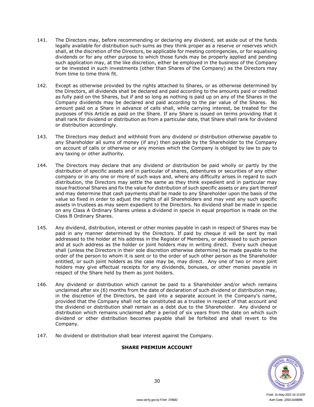 30 141. The Directors may, before recommending or declaring any dividend, set aside out of the funds legally available for distribution such sums as they think proper as a reserve or reserves which shall, at the discretion of the Directors, be applicable for meeting contingencies, or for equalising dividends or for any other purpose to which those funds may be properly applied and pending such application may, at the like discretion, either be employed in the business of the Company or be invested in such investments (other than Shares of the Company) as the Directors may from time to time think fit. 142. Except as otherwise provided by the rights attached to Shares, or as otherwise determined by the Directors, all dividends shall be declared and paid according to the amounts paid or credited as fully paid on the Shares, but if and so long as nothing is paid up on any of the Shares in the Company dividends may be declared and paid according to the par value of the Shares. No amount paid on a Share in advance of calls shall, while carrying interest, be treated for the purposes of this Article as paid on the Share. If any Share is issued on terms providing that it shall rank for dividend or distribution as from a particular date, that Share shall rank for dividend or distribution accordingly. 143. The Directors may deduct and withhold from any dividend or distribution otherwise payable to any Shareholder all sums of money (if any) then payable by the Shareholder to the Company on account of calls or otherwise or any monies which the Company is obliged by law to pay to any taxing or other authority. 144. The Directors may declare that any dividend or distribution be paid wholly or partly by the distribution of specific assets and in particular of shares, debentures or securities of any other company or in any one or more of such ways and, where any difficulty arises in regard to such distribution, the Directors may settle the same as they think expedient and in particular may issue fractional Shares and fix the value for distribution of such specific assets or any part thereof and may determine that cash payments shall be made to any Shareholder upon the basis of the value so fixed in order to adjust the rights of all Shareholders and may vest any such specific assets in trustees as may seem expedient to the Directors. No dividend shall be made in specie on any Class A Ordinary Shares unless a dividend in specie in equal proportion is made on the Class B Ordinary Shares. 145. Any dividend, distribution, interest or other monies payable in cash in respect of Shares may be paid in any manner determined by the Directors. If paid by cheque it will be sent by mail addressed to the holder at his address in the Register of Members, or addressed to such person and at such address as the holder or joint holders may in writing direct. Every such cheque shall (unless the Directors in their sole discretion otherwise determine) be made payable to the order of the person to whom it is sent or to the order of such other person as the Shareholder entitled, or such joint holders as the case may be, may direct. Any one of two or more joint holders may give effectual receipts for any dividends, bonuses, or other monies payable in respect of the Share held by them as joint holders. 146. Any dividend or distribution which cannot be paid to a Shareholder and/or which remains unclaimed after six (6) months from the date of declaration of such dividend or distribution may, in the discretion of the Directors, be paid into a separate account in the Company's name, provided that the Company shall not be constituted as a trustee in respect of that account and the dividend or distribution shall remain as a debt due to the Shareholder. Any dividend or distribution which remains unclaimed after a period of six years from the date on which such dividend or other distribution becomes payable shall be forfeited and shall revert to the Company. 147. No dividend or distribution shall bear interest against the Company. SHARE PREMIUM ACCOUNT Filed: 31-May-2022 16:13 EST Auth Code: J29211648896www.verify.gov.ky File#: 378682