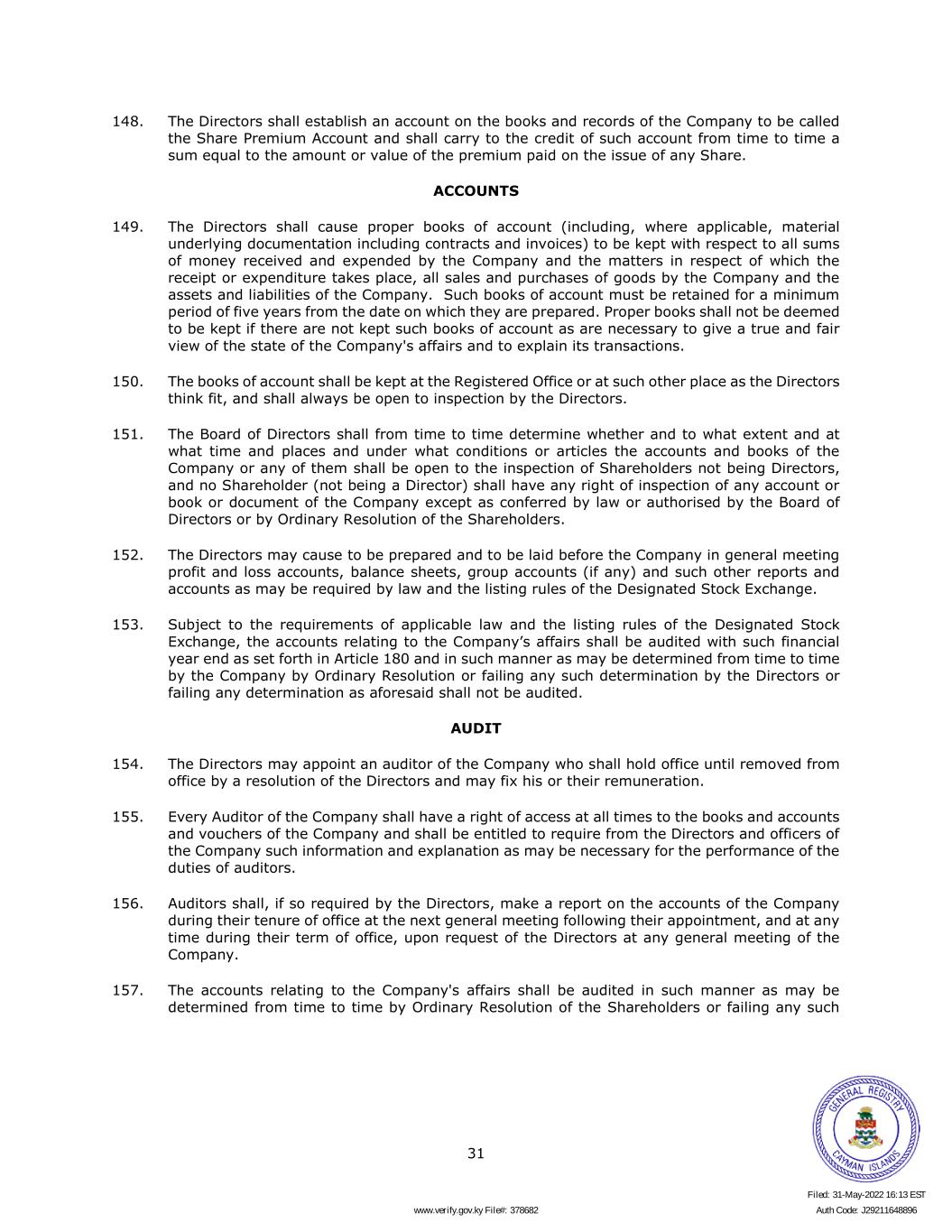31 148. The Directors shall establish an account on the books and records of the Company to be called the Share Premium Account and shall carry to the credit of such account from time to time a sum equal to the amount or value of the premium paid on the issue of any Share. ACCOUNTS 149. The Directors shall cause proper books of account (including, where applicable, material underlying documentation including contracts and invoices) to be kept with respect to all sums of money received and expended by the Company and the matters in respect of which the receipt or expenditure takes place, all sales and purchases of goods by the Company and the assets and liabilities of the Company. Such books of account must be retained for a minimum period of five years from the date on which they are prepared. Proper books shall not be deemed to be kept if there are not kept such books of account as are necessary to give a true and fair view of the state of the Company's affairs and to explain its transactions. 150. The books of account shall be kept at the Registered Office or at such other place as the Directors think fit, and shall always be open to inspection by the Directors. 151. The Board of Directors shall from time to time determine whether and to what extent and at what time and places and under what conditions or articles the accounts and books of the Company or any of them shall be open to the inspection of Shareholders not being Directors, and no Shareholder (not being a Director) shall have any right of inspection of any account or book or document of the Company except as conferred by law or authorised by the Board of Directors or by Ordinary Resolution of the Shareholders. 152. The Directors may cause to be prepared and to be laid before the Company in general meeting profit and loss accounts, balance sheets, group accounts (if any) and such other reports and accounts as may be required by law and the listing rules of the Designated Stock Exchange. 153. Subject to the requirements of applicable law and the listing rules of the Designated Stock Exchange, the accounts relating to the Company’s affairs shall be audited with such financial year end as set forth in Article 180 and in such manner as may be determined from time to time by the Company by Ordinary Resolution or failing any such determination by the Directors or failing any determination as aforesaid shall not be audited. AUDIT 154. The Directors may appoint an auditor of the Company who shall hold office until removed from office by a resolution of the Directors and may fix his or their remuneration. 155. Every Auditor of the Company shall have a right of access at all times to the books and accounts and vouchers of the Company and shall be entitled to require from the Directors and officers of the Company such information and explanation as may be necessary for the performance of the duties of auditors. 156. Auditors shall, if so required by the Directors, make a report on the accounts of the Company during their tenure of office at the next general meeting following their appointment, and at any time during their term of office, upon request of the Directors at any general meeting of the Company. 157. The accounts relating to the Company's affairs shall be audited in such manner as may be determined from time to time by Ordinary Resolution of the Shareholders or failing any such Filed: 31-May-2022 16:13 EST Auth Code: J29211648896www.verify.gov.ky File#: 378682