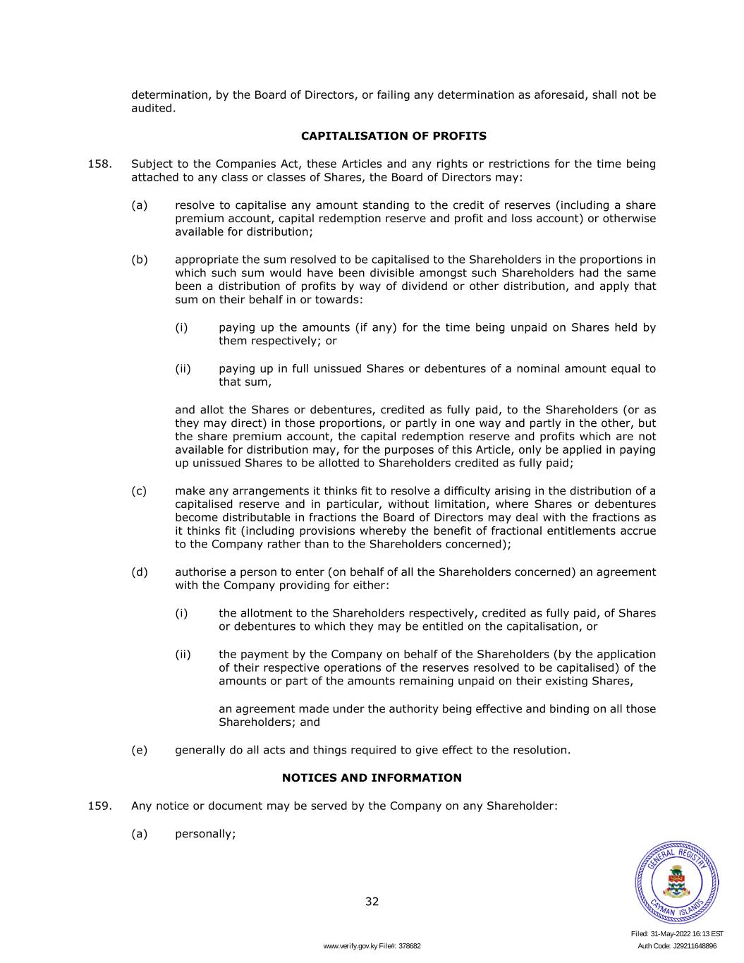 32 determination, by the Board of Directors, or failing any determination as aforesaid, shall not be audited. CAPITALISATION OF PROFITS 158. Subject to the Companies Act, these Articles and any rights or restrictions for the time being attached to any class or classes of Shares, the Board of Directors may: (a) resolve to capitalise any amount standing to the credit of reserves (including a share premium account, capital redemption reserve and profit and loss account) or otherwise available for distribution; (b) appropriate the sum resolved to be capitalised to the Shareholders in the proportions in which such sum would have been divisible amongst such Shareholders had the same been a distribution of profits by way of dividend or other distribution, and apply that sum on their behalf in or towards: (i) paying up the amounts (if any) for the time being unpaid on Shares held by them respectively; or (ii) paying up in full unissued Shares or debentures of a nominal amount equal to that sum, and allot the Shares or debentures, credited as fully paid, to the Shareholders (or as they may direct) in those proportions, or partly in one way and partly in the other, but the share premium account, the capital redemption reserve and profits which are not available for distribution may, for the purposes of this Article, only be applied in paying up unissued Shares to be allotted to Shareholders credited as fully paid; (c) make any arrangements it thinks fit to resolve a difficulty arising in the distribution of a capitalised reserve and in particular, without limitation, where Shares or debentures become distributable in fractions the Board of Directors may deal with the fractions as it thinks fit (including provisions whereby the benefit of fractional entitlements accrue to the Company rather than to the Shareholders concerned); (d) authorise a person to enter (on behalf of all the Shareholders concerned) an agreement with the Company providing for either: (i) the allotment to the Shareholders respectively, credited as fully paid, of Shares or debentures to which they may be entitled on the capitalisation, or (ii) the payment by the Company on behalf of the Shareholders (by the application of their respective operations of the reserves resolved to be capitalised) of the amounts or part of the amounts remaining unpaid on their existing Shares, an agreement made under the authority being effective and binding on all those Shareholders; and (e) generally do all acts and things required to give effect to the resolution. NOTICES AND INFORMATION 159. Any notice or document may be served by the Company on any Shareholder: (a) personally; Filed: 31-May-2022 16:13 EST Auth Code: J29211648896www.verify.gov.ky File#: 378682