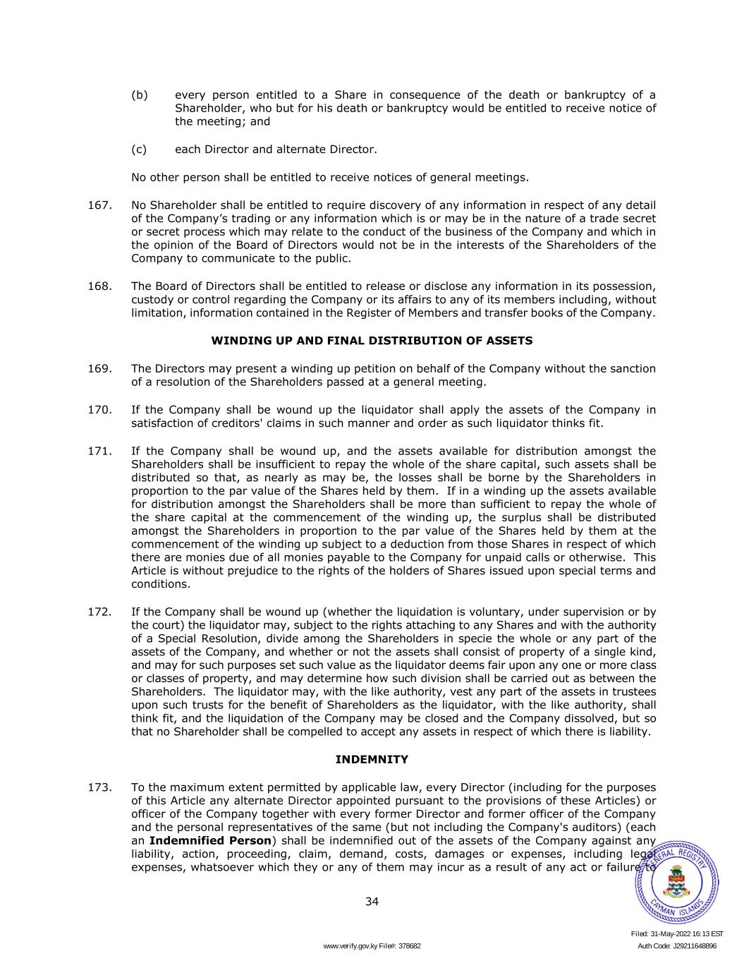 34 (b) every person entitled to a Share in consequence of the death or bankruptcy of a Shareholder, who but for his death or bankruptcy would be entitled to receive notice of the meeting; and (c) each Director and alternate Director. No other person shall be entitled to receive notices of general meetings. 167. No Shareholder shall be entitled to require discovery of any information in respect of any detail of the Company’s trading or any information which is or may be in the nature of a trade secret or secret process which may relate to the conduct of the business of the Company and which in the opinion of the Board of Directors would not be in the interests of the Shareholders of the Company to communicate to the public. 168. The Board of Directors shall be entitled to release or disclose any information in its possession, custody or control regarding the Company or its affairs to any of its members including, without limitation, information contained in the Register of Members and transfer books of the Company. WINDING UP AND FINAL DISTRIBUTION OF ASSETS 169. The Directors may present a winding up petition on behalf of the Company without the sanction of a resolution of the Shareholders passed at a general meeting. 170. If the Company shall be wound up the liquidator shall apply the assets of the Company in satisfaction of creditors' claims in such manner and order as such liquidator thinks fit. 171. If the Company shall be wound up, and the assets available for distribution amongst the Shareholders shall be insufficient to repay the whole of the share capital, such assets shall be distributed so that, as nearly as may be, the losses shall be borne by the Shareholders in proportion to the par value of the Shares held by them. If in a winding up the assets available for distribution amongst the Shareholders shall be more than sufficient to repay the whole of the share capital at the commencement of the winding up, the surplus shall be distributed amongst the Shareholders in proportion to the par value of the Shares held by them at the commencement of the winding up subject to a deduction from those Shares in respect of which there are monies due of all monies payable to the Company for unpaid calls or otherwise. This Article is without prejudice to the rights of the holders of Shares issued upon special terms and conditions. 172. If the Company shall be wound up (whether the liquidation is voluntary, under supervision or by the court) the liquidator may, subject to the rights attaching to any Shares and with the authority of a Special Resolution, divide among the Shareholders in specie the whole or any part of the assets of the Company, and whether or not the assets shall consist of property of a single kind, and may for such purposes set such value as the liquidator deems fair upon any one or more class or classes of property, and may determine how such division shall be carried out as between the Shareholders. The liquidator may, with the like authority, vest any part of the assets in trustees upon such trusts for the benefit of Shareholders as the liquidator, with the like authority, shall think fit, and the liquidation of the Company may be closed and the Company dissolved, but so that no Shareholder shall be compelled to accept any assets in respect of which there is liability. INDEMNITY 173. To the maximum extent permitted by applicable law, every Director (including for the purposes of this Article any alternate Director appointed pursuant to the provisions of these Articles) or officer of the Company together with every former Director and former officer of the Company and the personal representatives of the same (but not including the Company's auditors) (each an Indemnified Person) shall be indemnified out of the assets of the Company against any liability, action, proceeding, claim, demand, costs, damages or expenses, including legal expenses, whatsoever which they or any of them may incur as a result of any act or failure to Filed: 31-May-2022 16:13 EST Auth Code: J29211648896www.verify.gov.ky File#: 378682