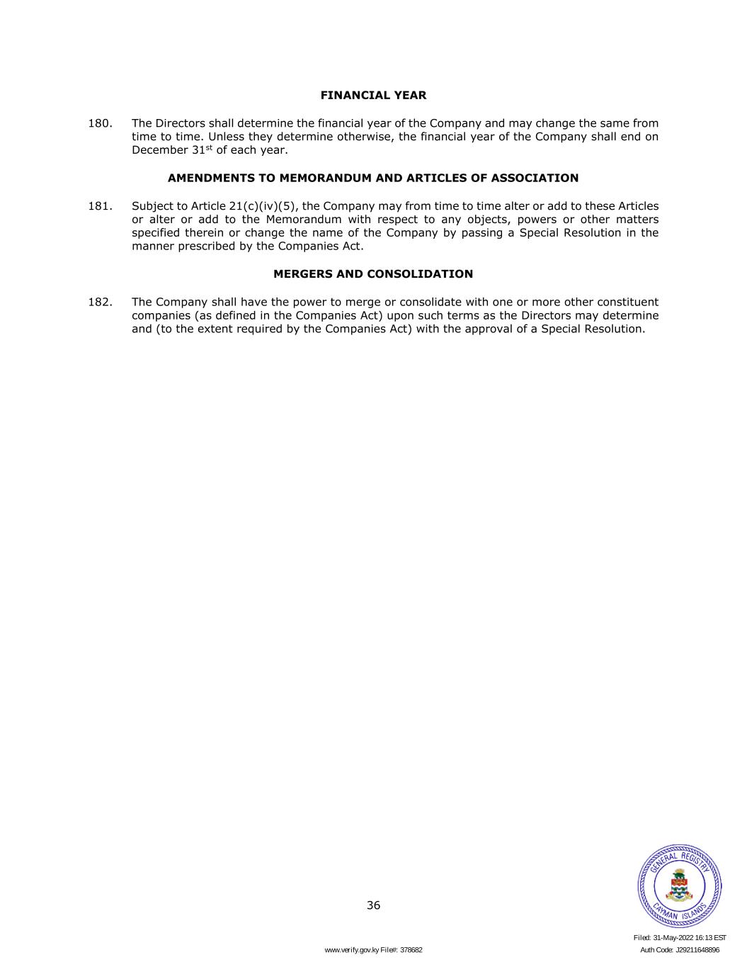 36 FINANCIAL YEAR 180. The Directors shall determine the financial year of the Company and may change the same from time to time. Unless they determine otherwise, the financial year of the Company shall end on December 31st of each year. AMENDMENTS TO MEMORANDUM AND ARTICLES OF ASSOCIATION 181. Subject to Article 21(c)(iv)(5), the Company may from time to time alter or add to these Articles or alter or add to the Memorandum with respect to any objects, powers or other matters specified therein or change the name of the Company by passing a Special Resolution in the manner prescribed by the Companies Act. MERGERS AND CONSOLIDATION 182. The Company shall have the power to merge or consolidate with one or more other constituent companies (as defined in the Companies Act) upon such terms as the Directors may determine and (to the extent required by the Companies Act) with the approval of a Special Resolution. Filed: 31-May-2022 16:13 EST Auth Code: J29211648896www.verify.gov.ky File#: 378682