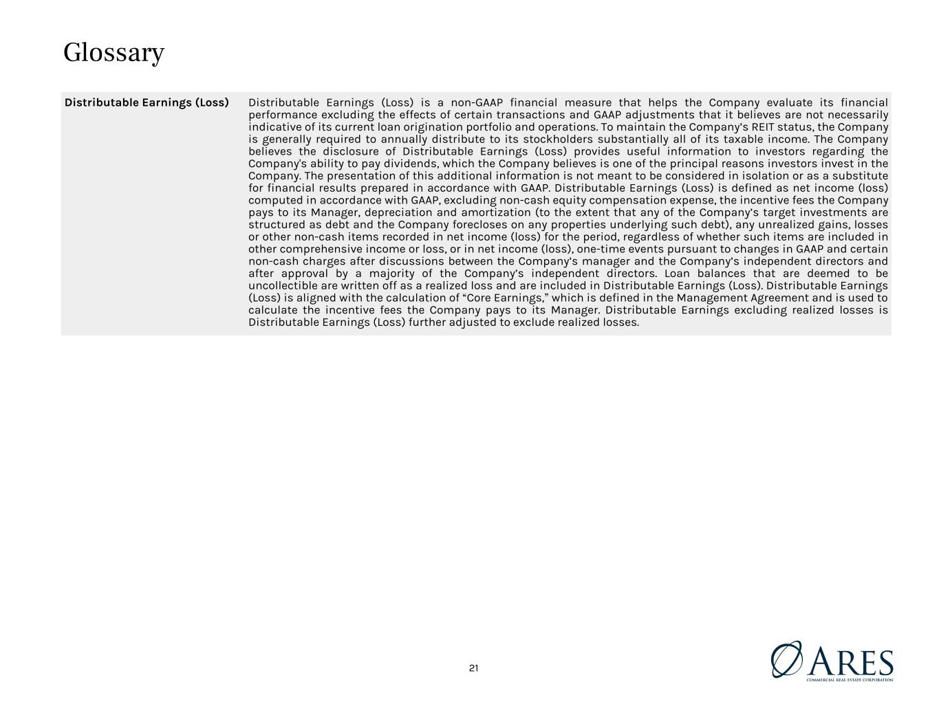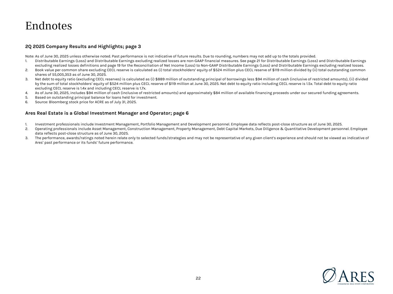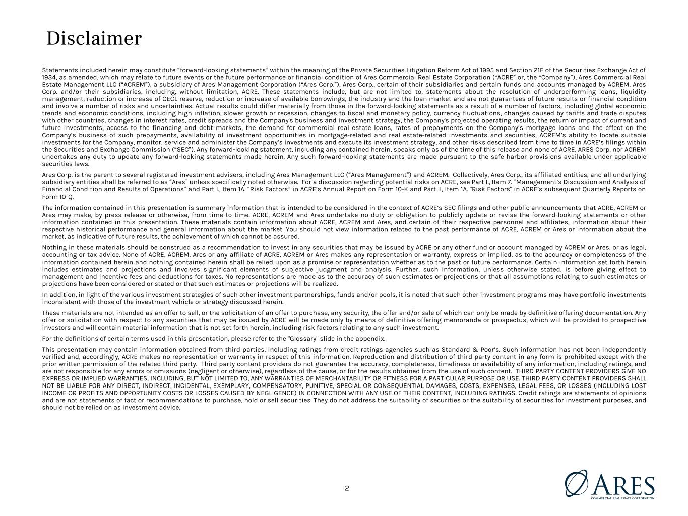 本書またはウェブキャスト/電話会議に含まれる記述は、1995年米国私募証券訴訟改革法(Private Securities Litigation Reform Act of 1995)、1933年米国証券法(Securities Act of 1933)第27A条、および1934年米国証券取引法(Securities and Exchange Act of 1934)第21E条(Securities and Exchange Act of 1934)の定義における「将来予想に関する記述」に該当する可能性があります。これらの記述は、将来の出来事または当社の将来の業績もしくは財務状況に関連するものであり、不良債権の処理、流動性管理、CECL準備金の削減または増加、利用可能借入金の削減または増加、業界およびローン市場に関する記述が含まれますが、これらに限定されるものではありません。これらの記述は将来の業績、状況、結果を保証するものではなく、多くのリスクと不確実性を伴います。高インフレ、成長鈍化または景気後退を含む世界的な経済動向や経済状況、財政・金融政策の変更、為替変動、関税や他国との貿易紛争による変化、金利、信用スプレッドおよび当社の投資市場価値の変動、当社の事業および投資戦略、当社の予想営業成績、現在および将来の投資の収益または影響、資金調達および負債市場へのアクセス、商業用不動産ローンに対する需要など、多くの要因の結果として、実際の結果が将来の見通しに関する記述と大きく異なる可能性があります、当社のモーゲージローンの期限前償還率およびそのような期限前償還が当社の事業に及ぼす影響、モーゲージ関連および不動産関連の投資および証券における投資機会の利用可能性、Ares Commercial Real Estate Management LLC(「ACREM」または当社の「マネージャー」)が当社に適した投資先を見つける能力、当社の投資案件を監視、サービス、管理し、投資戦略を実行する能力、および当社が米国証券取引委員会(以下「SEC」)に提出した書類に随時記載されているリスク(パートI、項目1Aに記載されているリスク要因を含むが、これらに限定されない)。