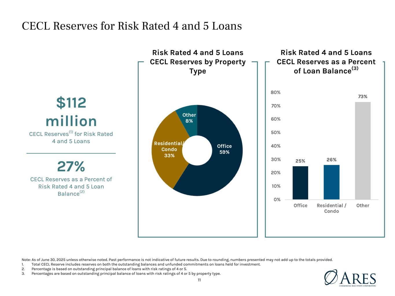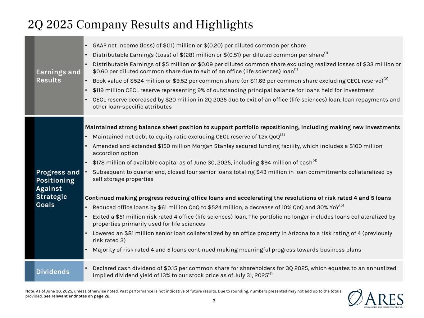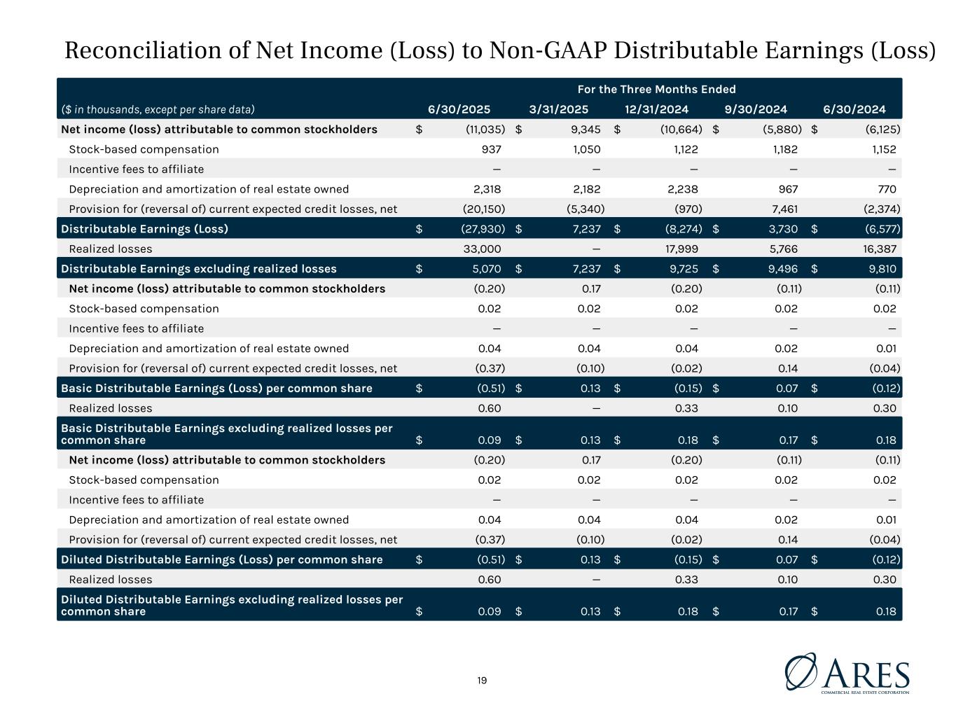 ニューヨーク発-(BUSINESS WIRE)-主に商業用不動産資産の直接組成・投資に携わるスペシャリティ・ファイナンス会社、アレス・コマーシャル・リアル・エステート・コーポレーション(以下「当社」)(NYSE:ACRE)は、2025年度第2四半期の一般に公正妥当と認められた会計原則(GAAP)に基づく当期純利益(損失)を1,100万ドル(希薄化後普通株式1株当たり0.20ドル)、分配可能利益(損失)(1)を2,790万ドル(希薄化後普通株式1株当たり0.51ドル)と報告しました。