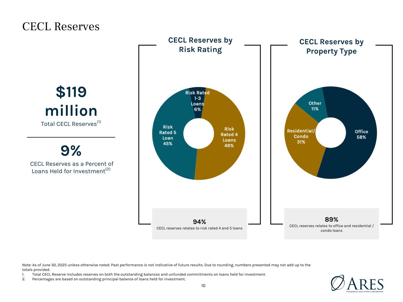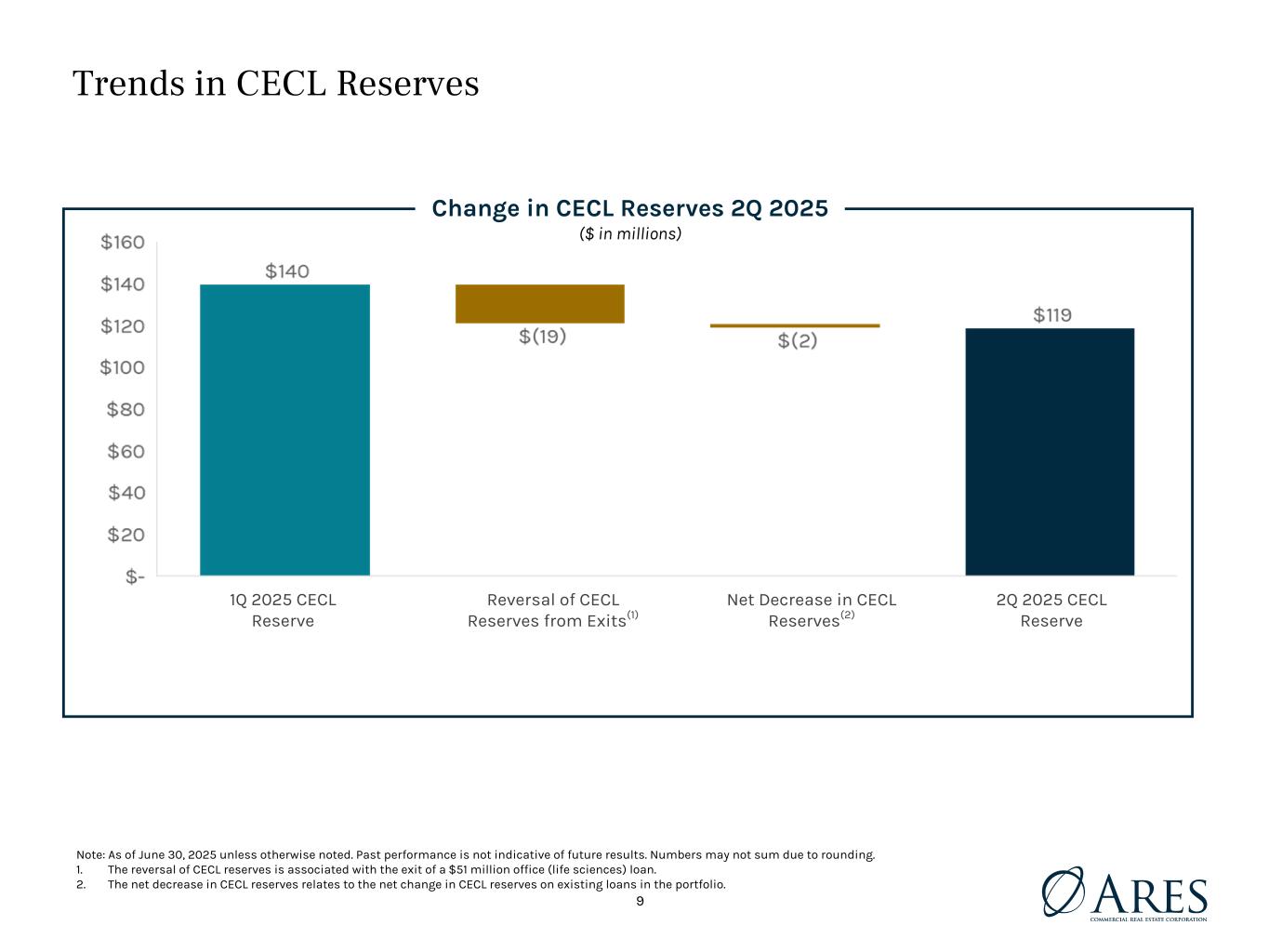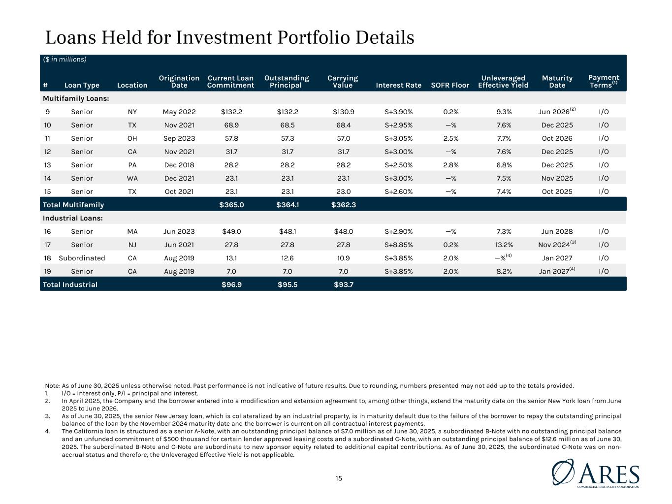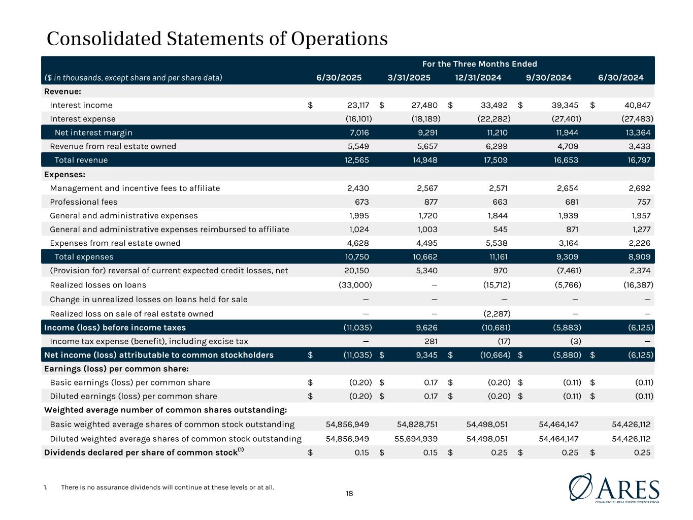 ニューヨーク発-(BUSINESS WIRE)-主に商業用不動産資産の直接組成・投資に携わるスペシャリティ・ファイナンス会社、アレス・コマーシャル・リアル・エステート・コーポレーション(以下「当社」)(NYSE:ACRE)は、2025年度第2四半期の一般に公正妥当と認められた会計原則(GAAP)に基づく当期純利益(損失)を1,100万ドル(希薄化後普通株式1株当たり0.20ドル)、分配可能利益(損失)(1)を2,790万ドル(希薄化後普通株式1株当たり0.51ドル)と報告しました。